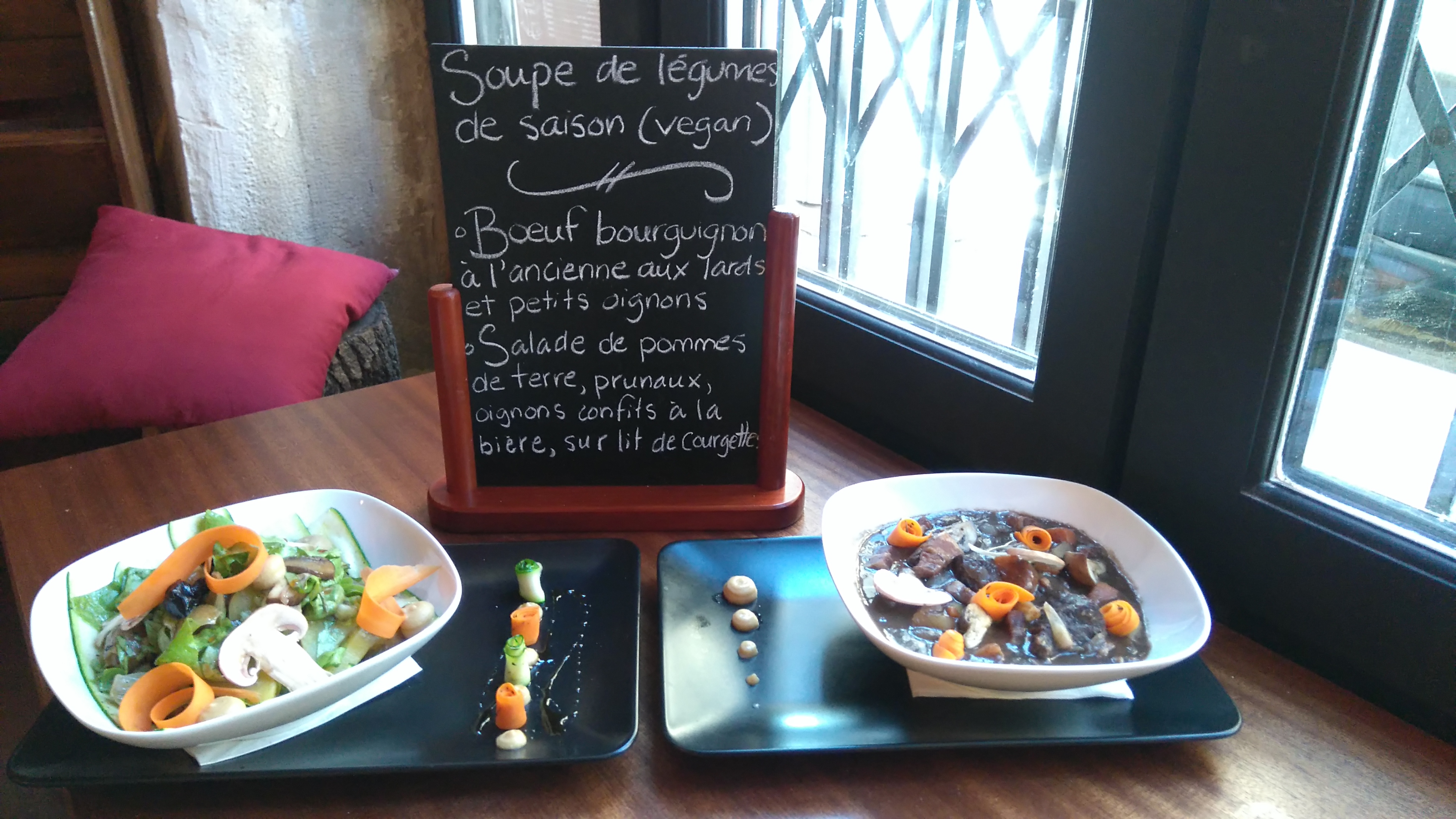 La perfection !?! :) Bio, local, fait maison, possibilités végé, sur-mesure, carte courte, humour, décoration sympa, accepte la MIEL.