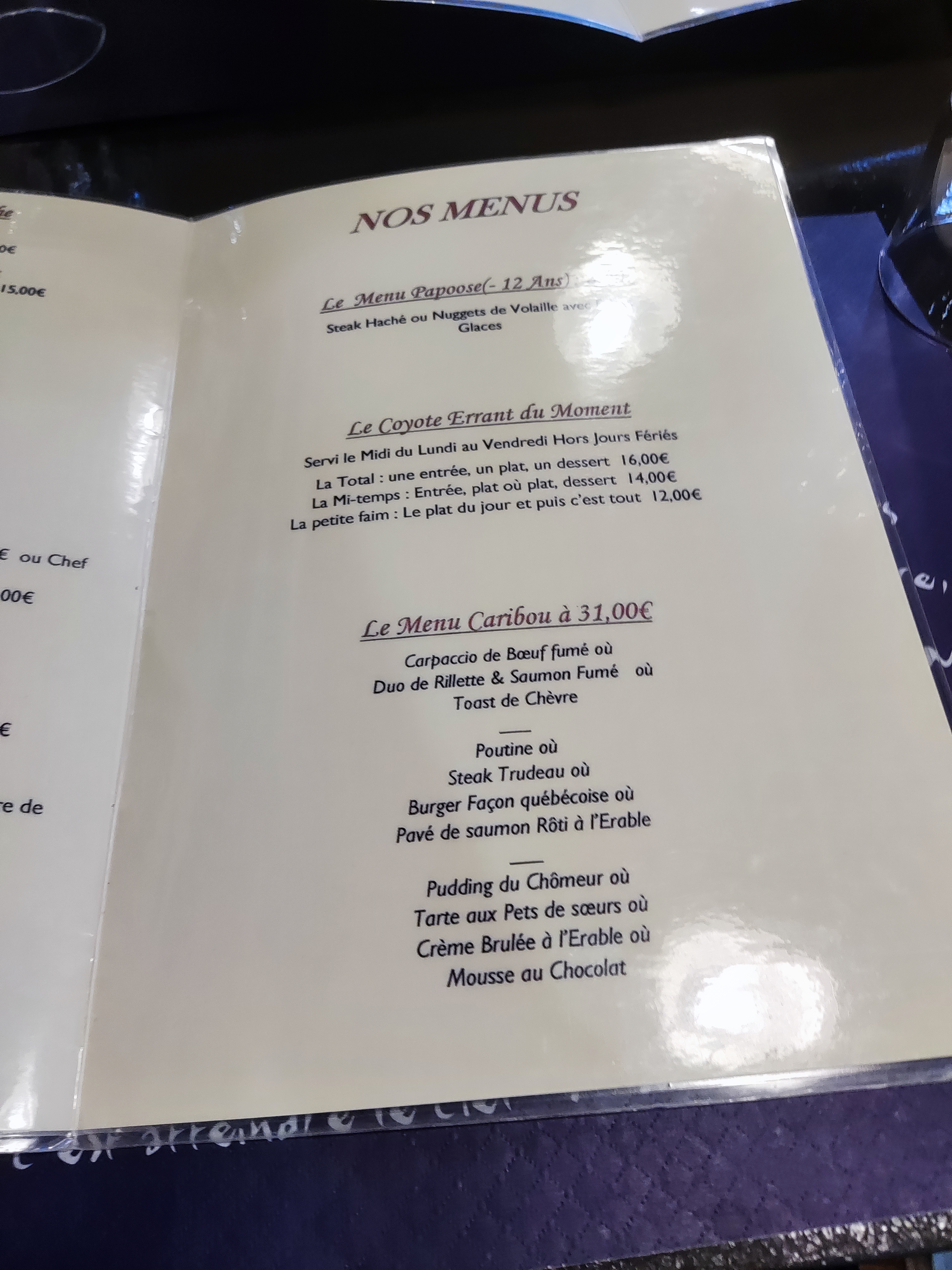 Accueil chaleureux et service attentionné. Déco dépaysante. Mais déception pour nous : la poutine n’a rien de canadien. Ne cherchez ni fromage en grains, ni sauce brune, on est plutôt sur une version bolognaise. Il faudrait que ce soit indiqué sur la carte. Le saumon en revanche est excellent. La crème brûlée à l’érable est aussi une déception, on ne sentait pas l’érable. Le café gourmand est réservé aux toutes petites faims et est très français : mousse et mini crème brûlée avec un peu de chantilly. J’aurais espéré des desserts plus canadiens comme le pudding chômeur ou la tarte aux pets de sœur. Nous en avons eu pour 136€ à 4 (avec en boisson un verre de vin et 3 softs).