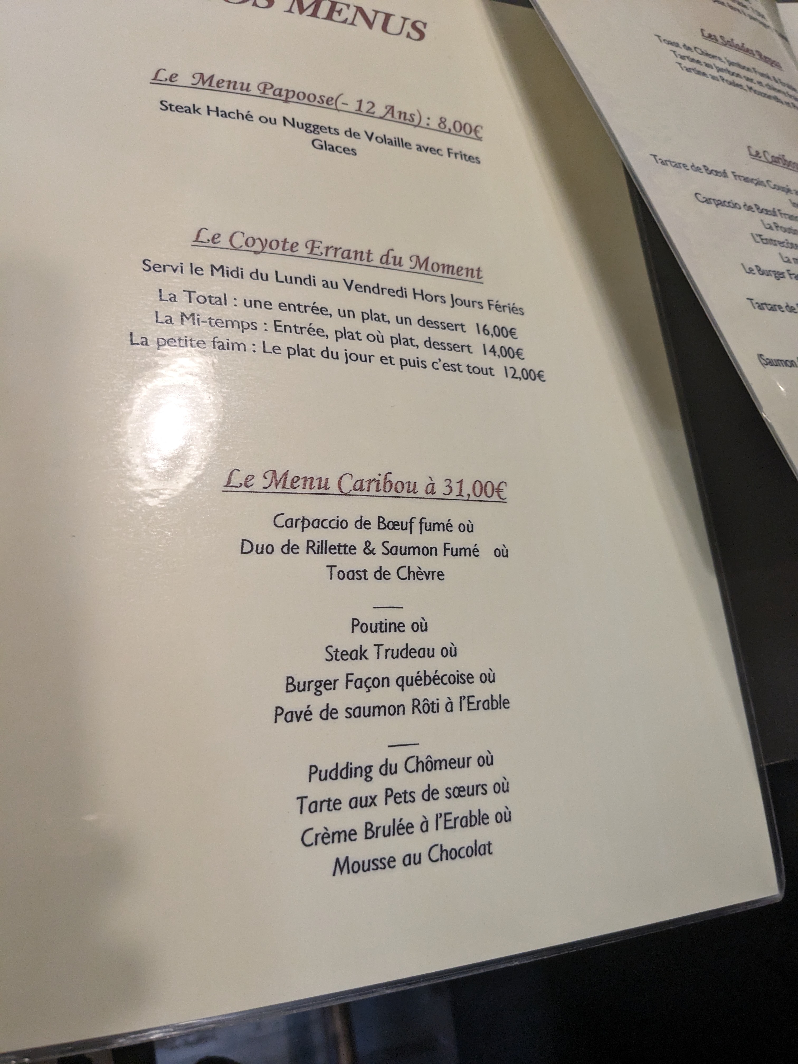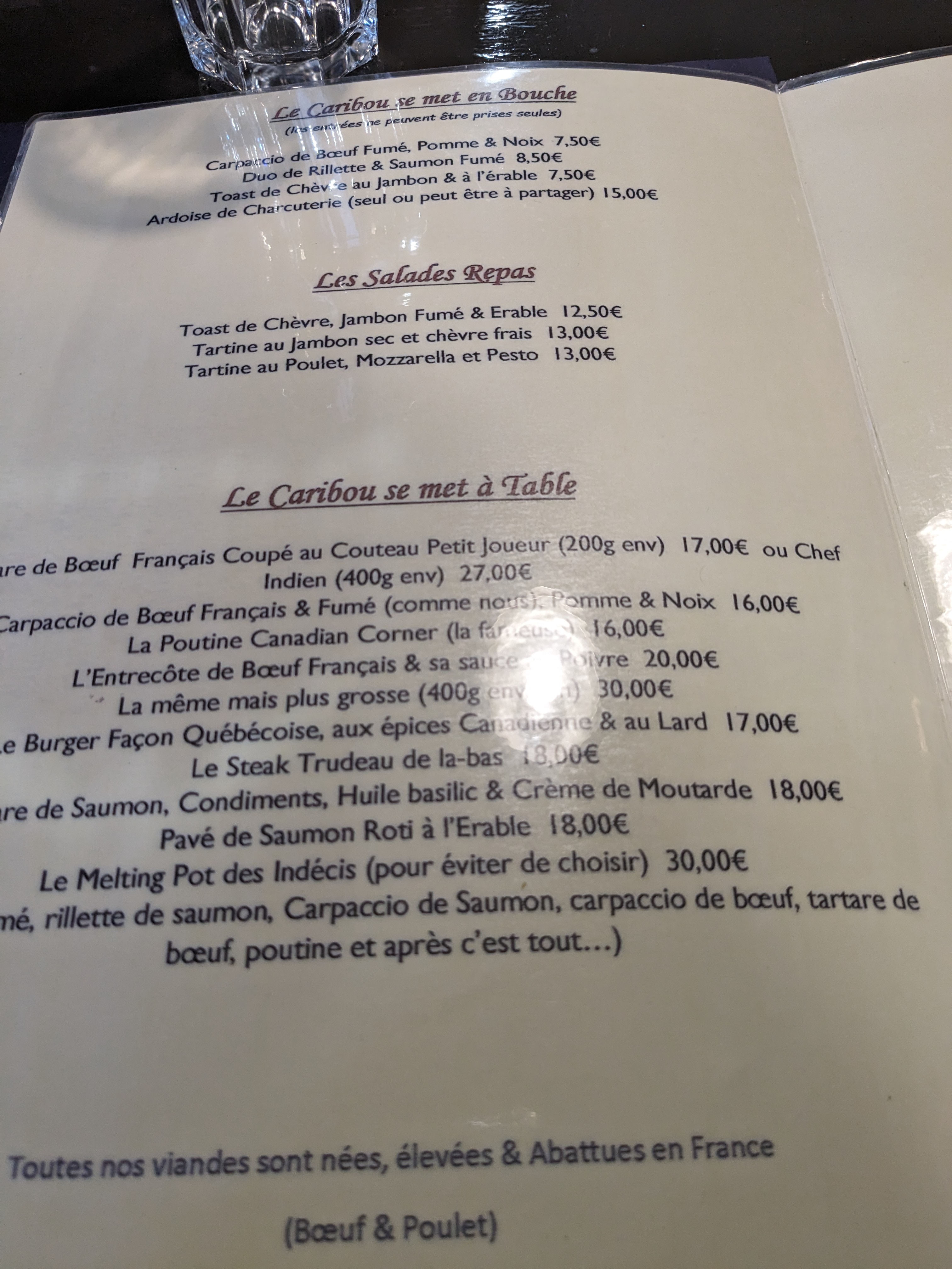 Ambiance sympathique. Décoration en mode trappeur. Le serveur fort aimable. La salade prise était bonne, j'ai moins aimé les desserts du thé gourmand. Mon ami avait pris un burger, mais la cuisson ne correspondait pas à sa demande. Dommage. Nous avons goûté la poutine et nous n'avons pas trop aimé. Bien différente de ce que l'on peut avoir au Canada. J'enlève une étoile car nous avons été déçus de la carte proposée. Peu de choix et beaucoup de plats étaient orientés viande et cru.