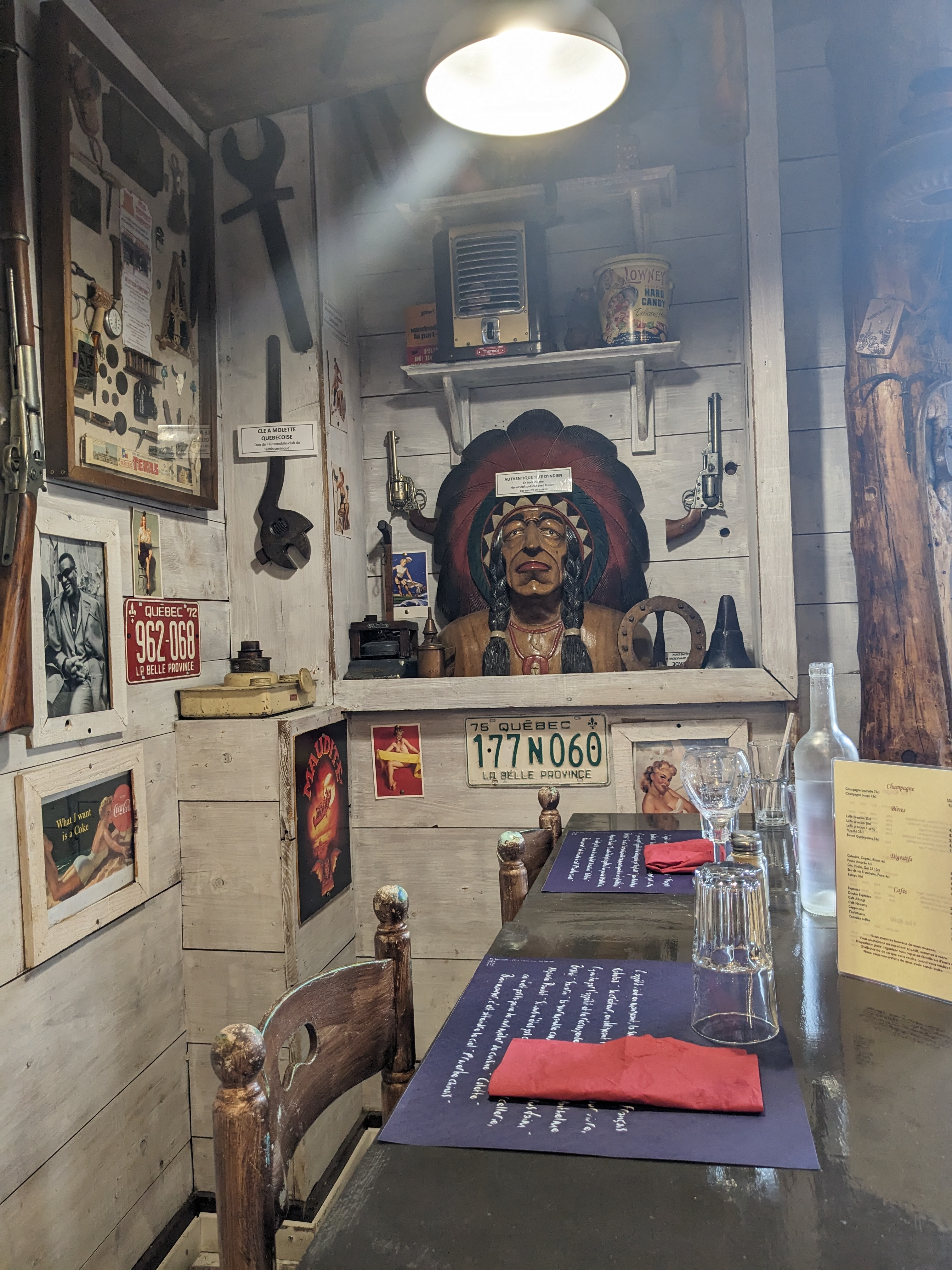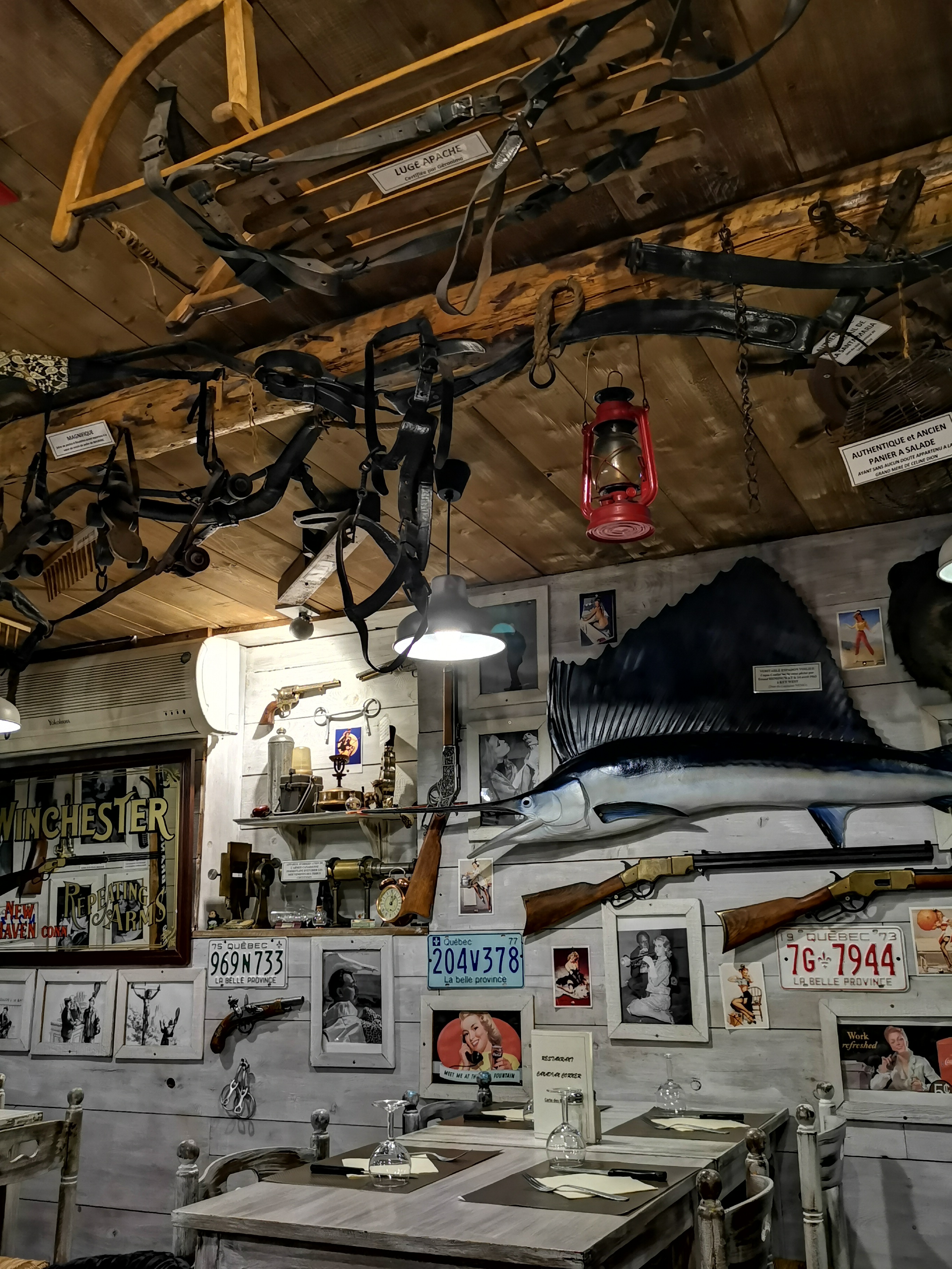Jolie déco de beaux objets, même si un peu trop nombreux à mon goût, pour la nourriture un peu déçu, je m attends a des spécialités du Canada, réel poutine, du bon saumon voir même du caribous, ou de bons burger maison mais non, je me retrouve avec un Buffalo Grill déguisé, entrecôte française, saumon sans indication de provenance, pas de burger, pas de menu le soir, poutine à 15€ j ai pas osé, j ai eut peur du résultat... Dommage, prix plutôt correcte comme au Buffalo.
