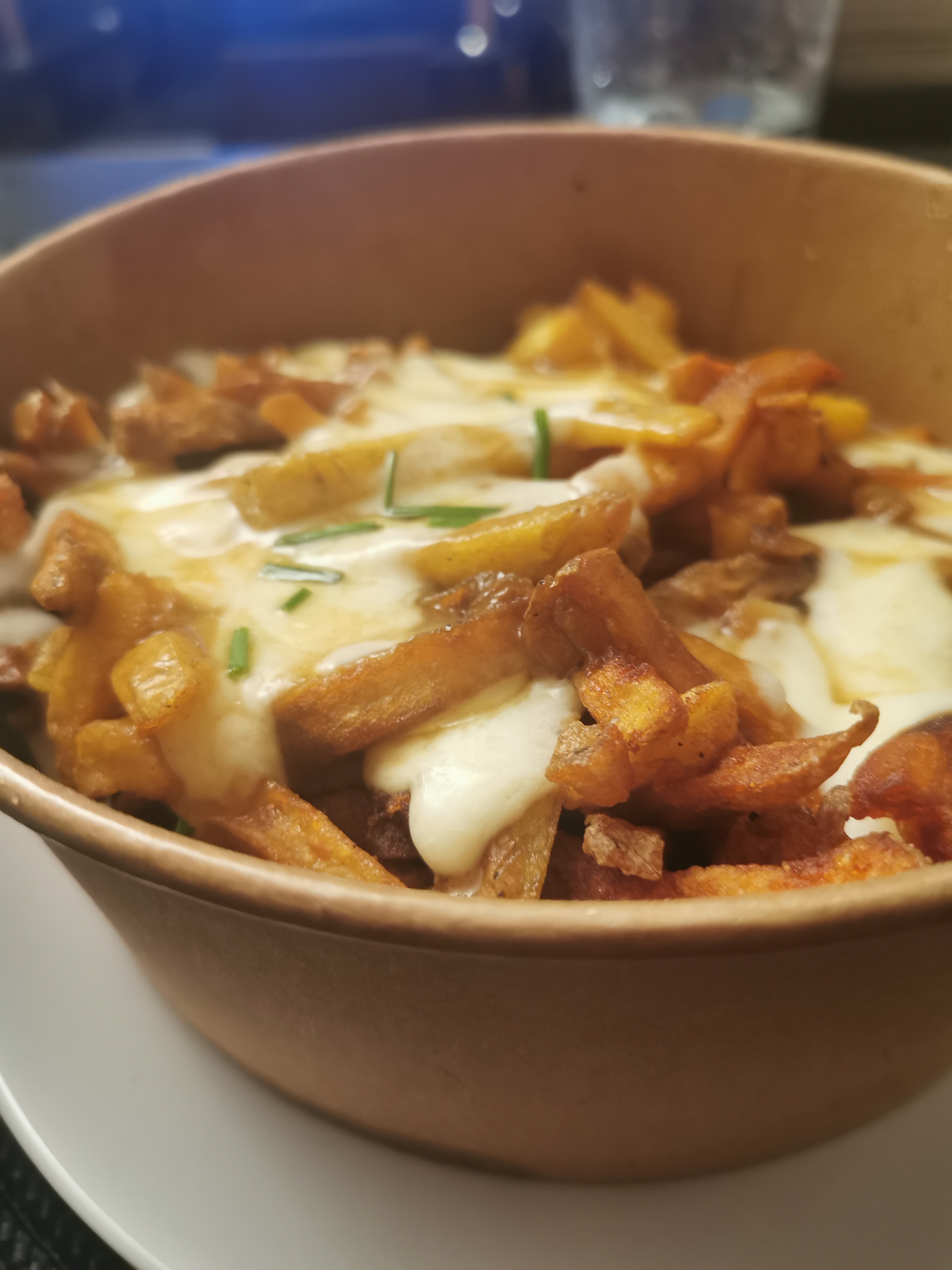 Commandé à emporter par un service de livraison super rapide. Je ne connaissais pas la poutine mais c'est un bon plat que j'ai mangé avec régal. Ce n'est pas donné mais les ingrédient sont frais. Je comprend que certaines personnes soient étonnées mais ne vous attendez pas à des frites croustillantes! C'est le principe de la poutine, il y a de la sauce liquide sur les frites avec du fromage fondu. C'est un peu déroutant mais j'ai aimé et la quantité est plus que suffisante. A conseiller pour changer de l'ordinaire!