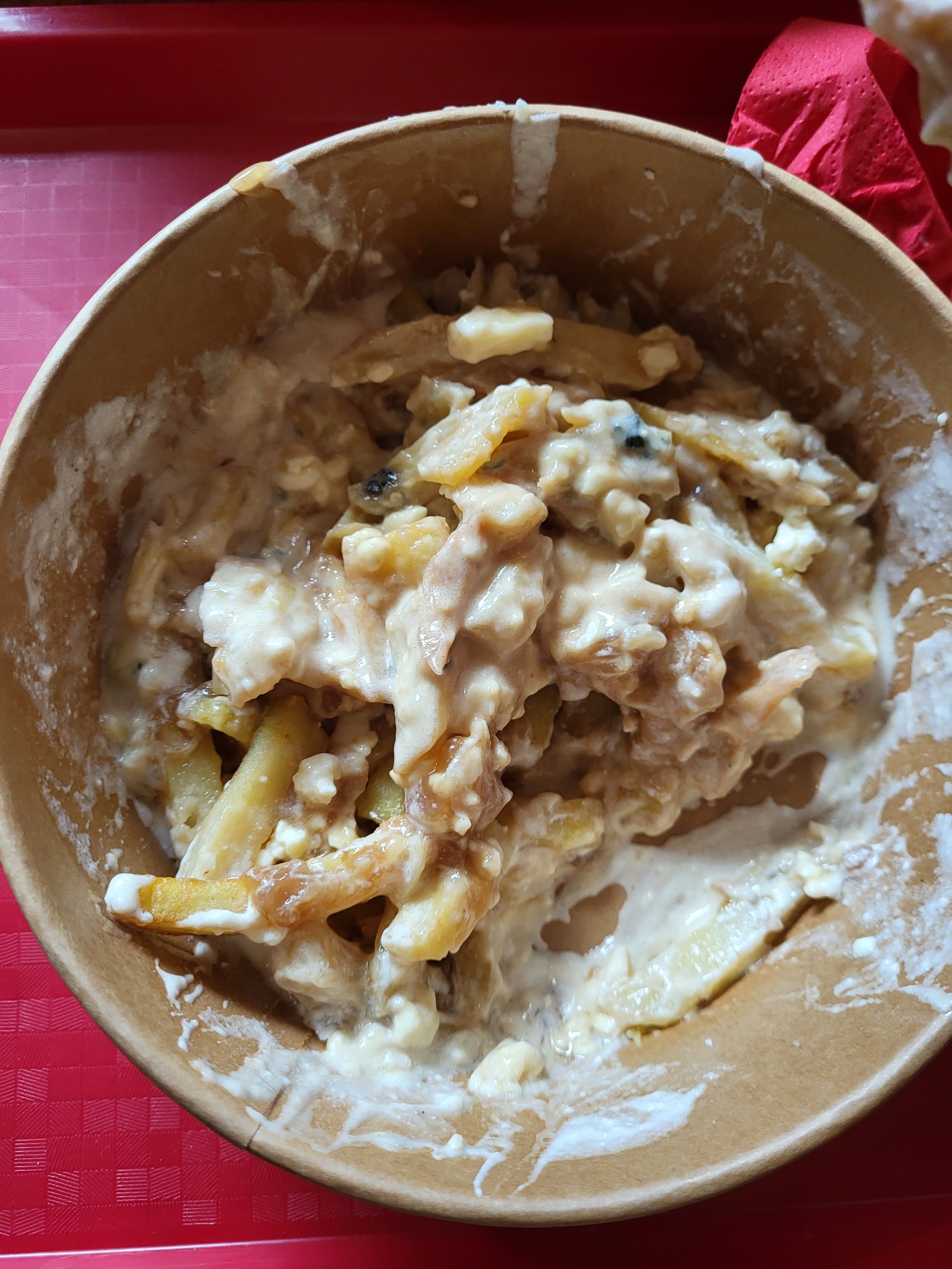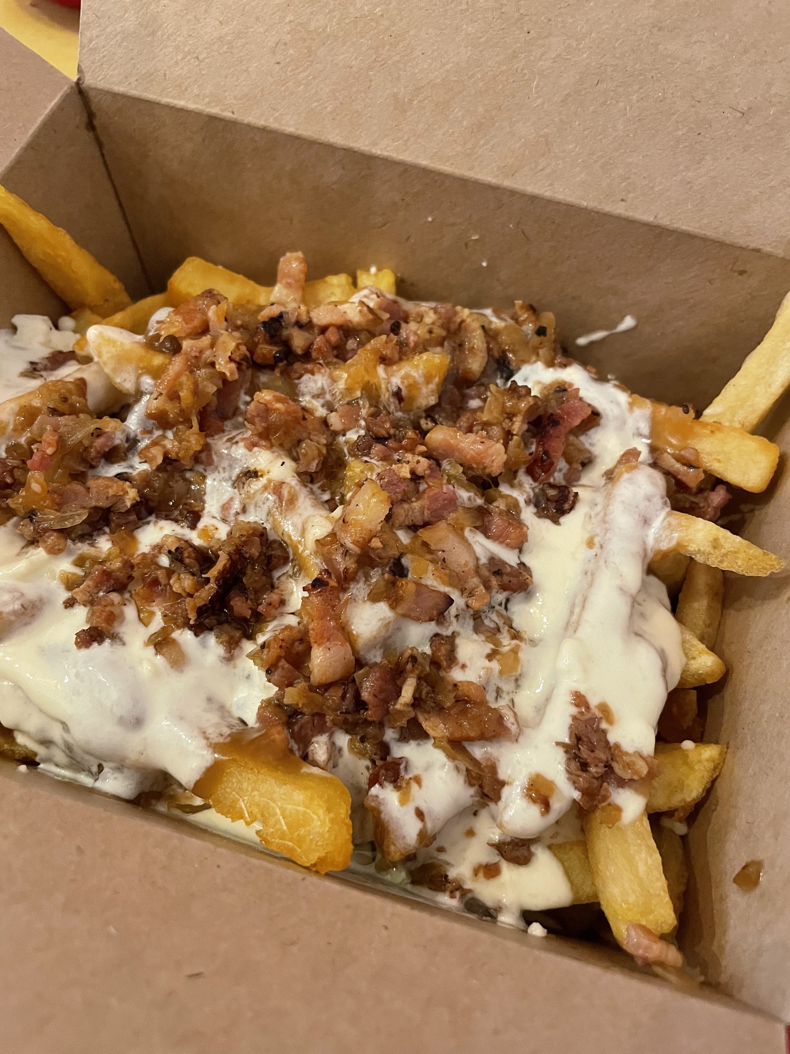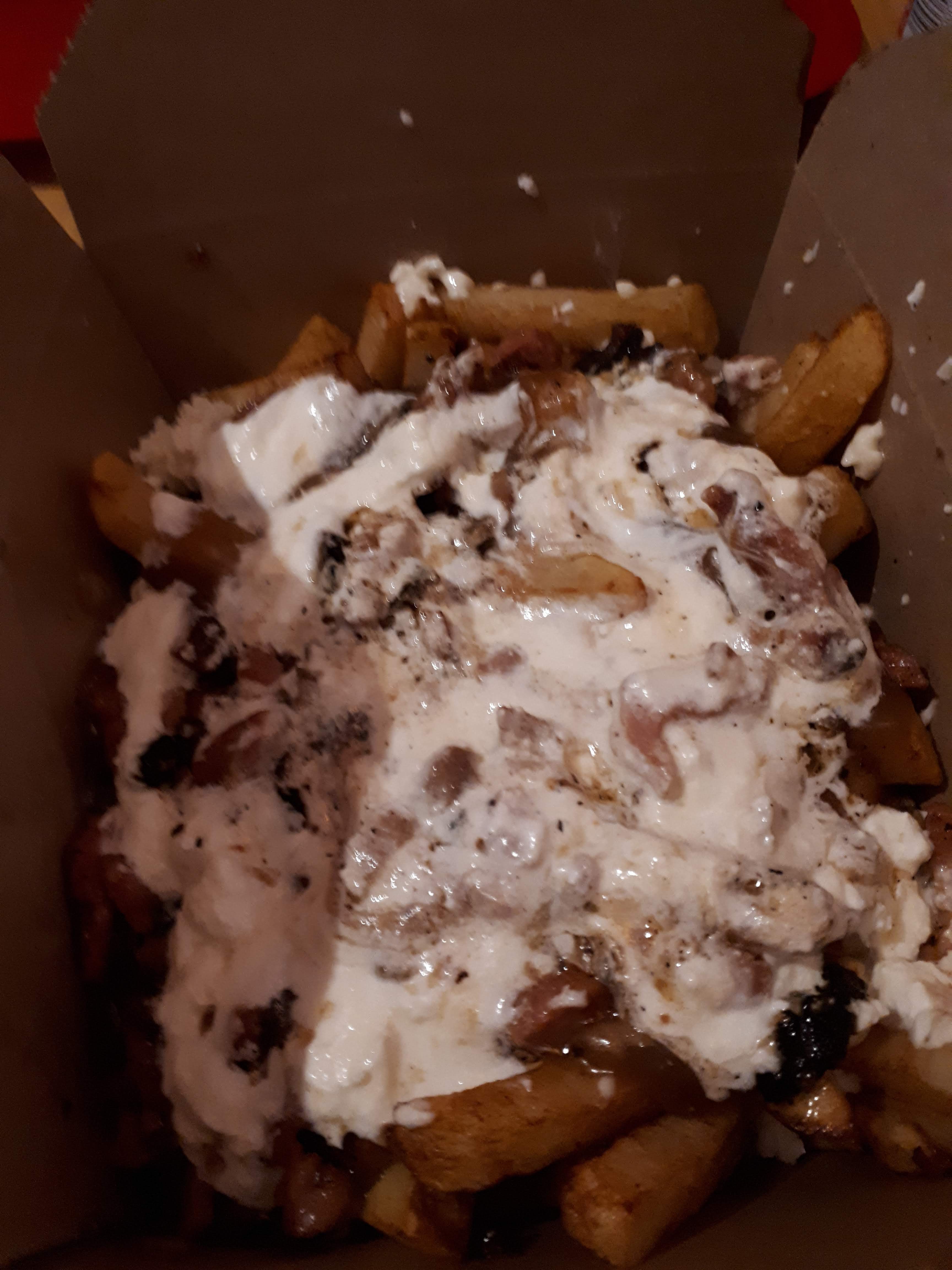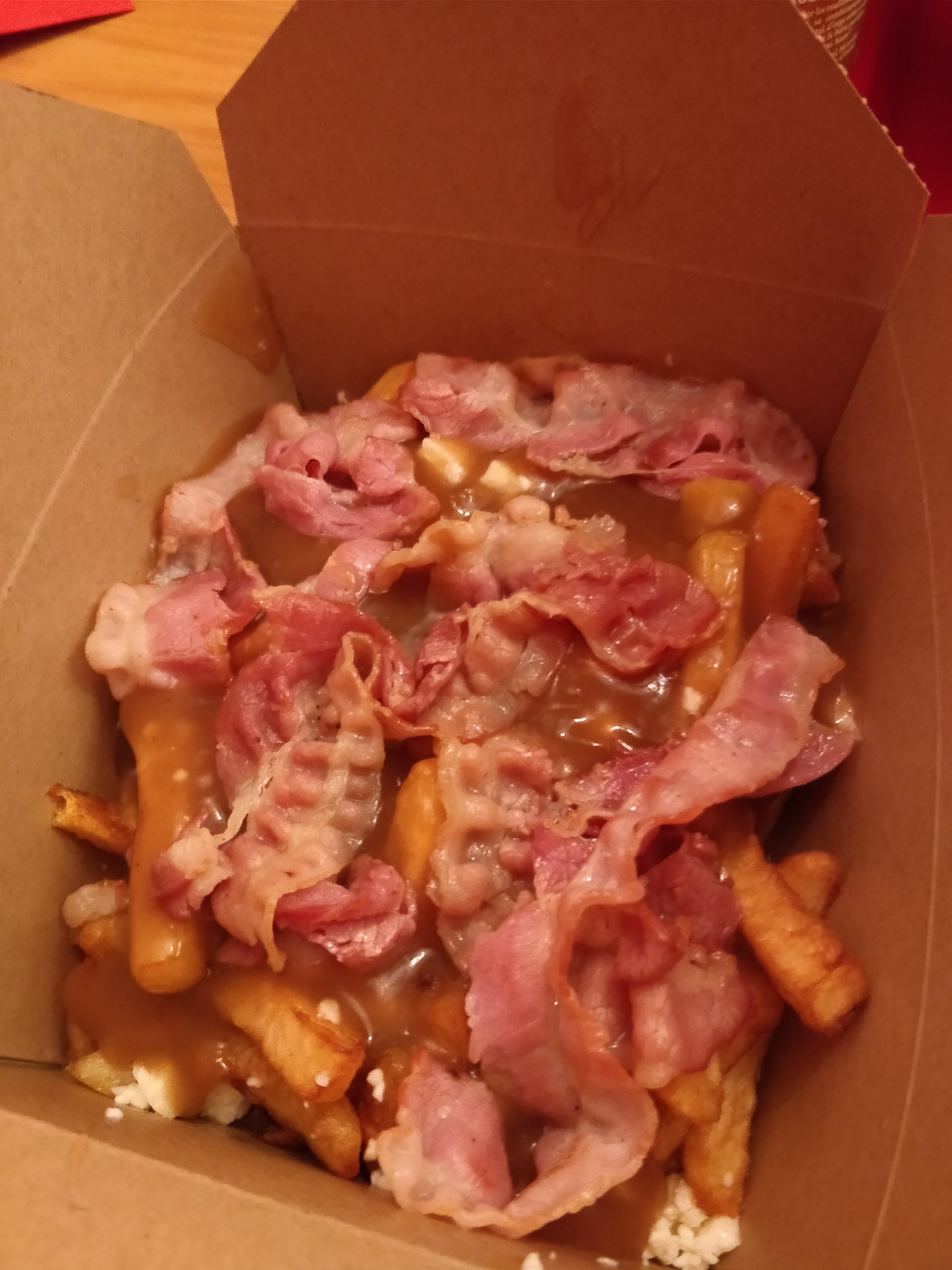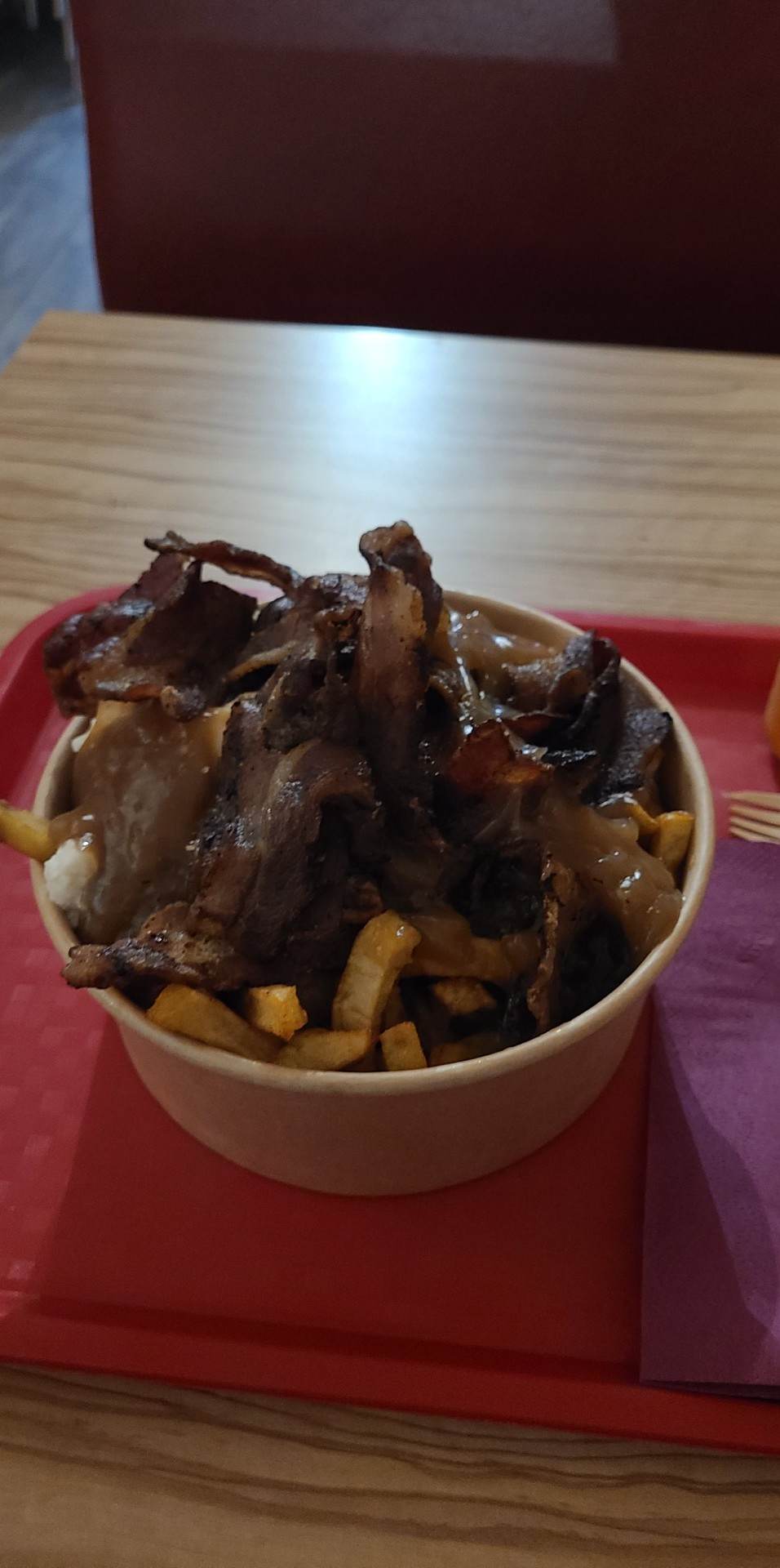 Frites molles mais bonnes avec une sauce sans aucun goût, ni sucrée, ni salée, plutôt frustrant car elle est censée avoir le goût de sirop d'érable... On a pris la version maxi au bacon, il n'y avait pas beaucoup de viande. Avec tous les avis positifs, on s'attendait à quelque chose de bien meilleur.