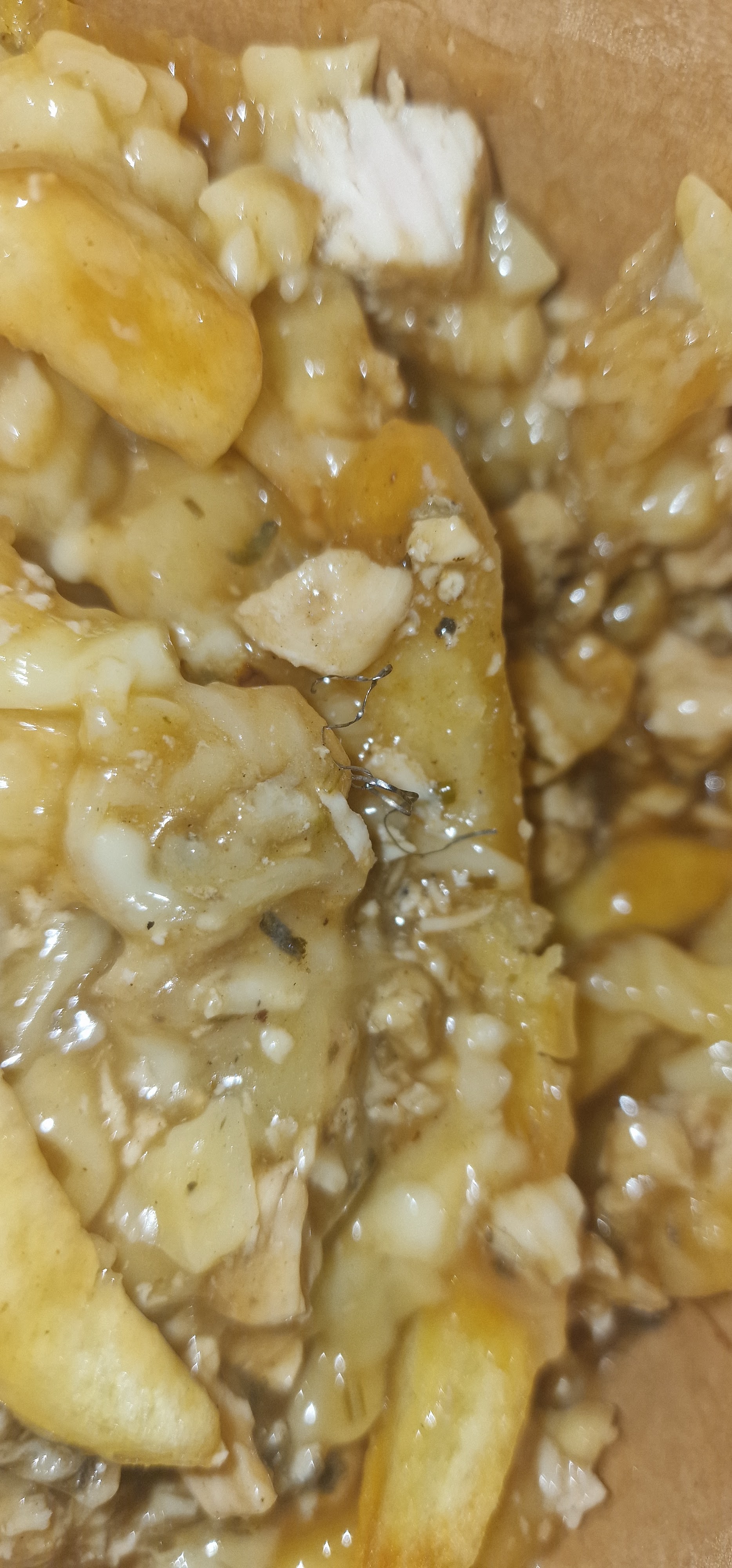 Frites pas cuites ça donne mal au ventres, froid, très peu de fromage, portion TRÈS PETITE!! Très décevant.