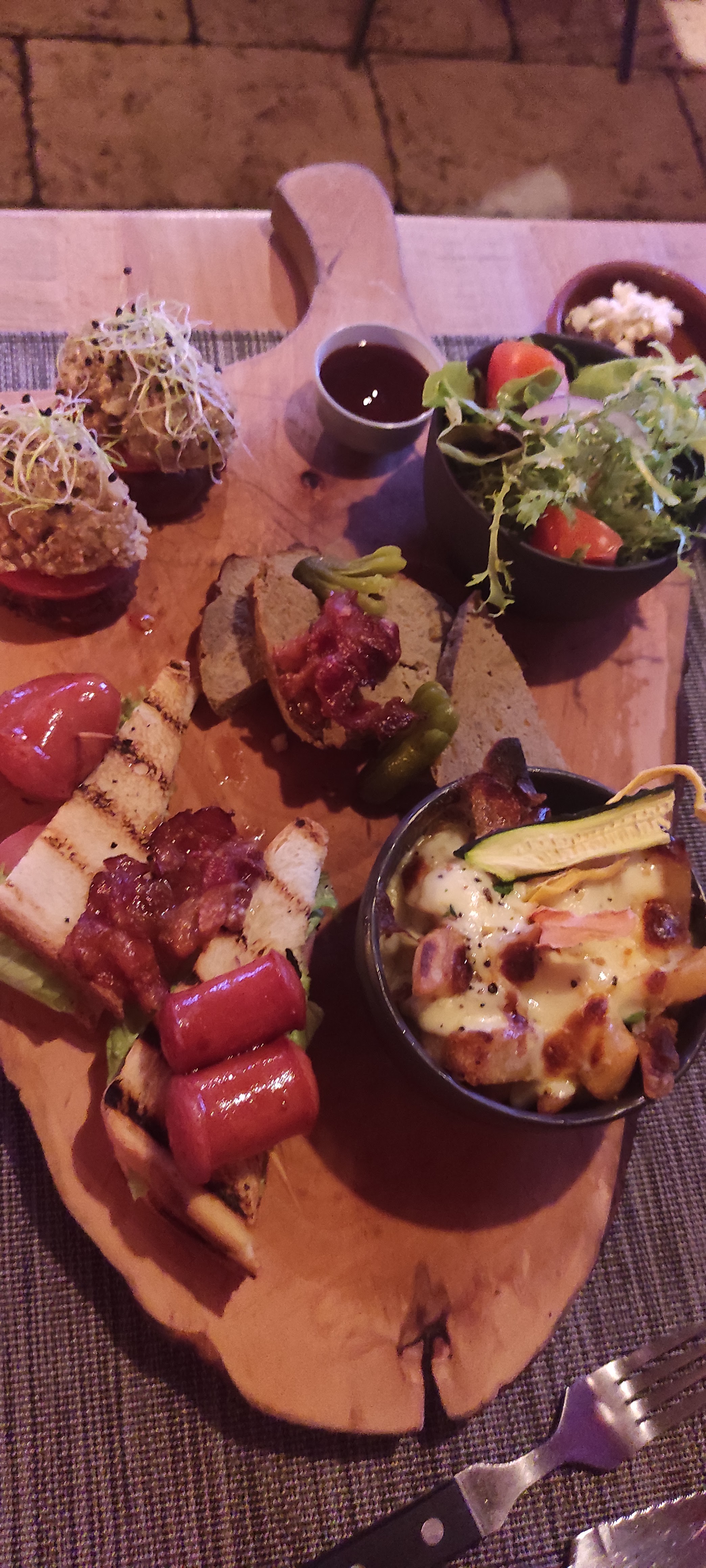 Très bon repas malheureusement gâché par l’attitude de la serveuse… cette dernière, après avoir reconnu un membre de notre table (qu’elle a croisé une seule fois ailleurs il y a peu de temps) s’est mise à nous raconter sa vie à chaque fois qu’elle apportait ou débarrassait un plat…jusqu’à nous parler de son analyse d’urine qu’elle doit faire!!! Non mais on va où ??? Si on vient au restaurant c’est pour un moment convivial entre amis ou en famille et pas pour que la serveuse nous expose sa vie. Quant au service… elle se plaint du poids des assiettes et des planches et ne fait même pas le tour pour chaque personne, elle tend les plats depuis le bout de la table…