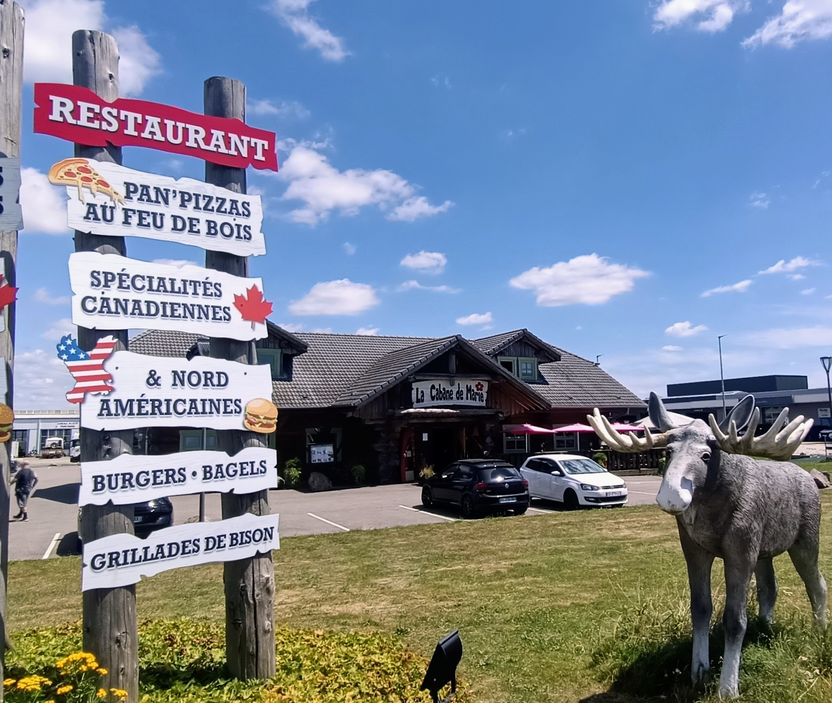 A force de passer devant ce magnifique chalet en rondins qui fleure bon LA BELLE PROVINCE lors de nos balades à moto, il a bien fallu s'y arrêter un jour, pour voir si la cuisine est à la hauteur de l'espoir que suscite l'élan qui vous accueille dès le parking. Après l'élan, on croise un bison, puis un grizzli pour se retrouver dans une grande salle dans laquelle on peut s'imaginer être dans une CABANE à SUCRE . Accueil avec le sourire et heureusement que nous avons réservé, car c'est complet et de nombreuses personnes sont éconduites. Concession à la modernité, le menu est sur tablette, avec de belles photos et bien détaillé, ce qui permet aisément de faire son choix. Entrée et plat identiques pour mon épouse et moi-même. Mini poutine en entrée et travers de porc caramélisé à l'érable en plat principal. Excellents et copieux tous les 2, au point que nous avons hésité (pas très longtemps) à prendre un dessert. Un Cheese cake au chocolat blanc pour moi et une glace Dame noire pour mon épouse. Bon, ben, on le savait ! On aurait pas du ..., mais pas facile de résister aux belles images sur la tablette. De l'accueil au dessert, LA CABANE DE MARIE est une agréable expérience que nous recommandons à tous ceux qui aiment voyager sans se ruiner.