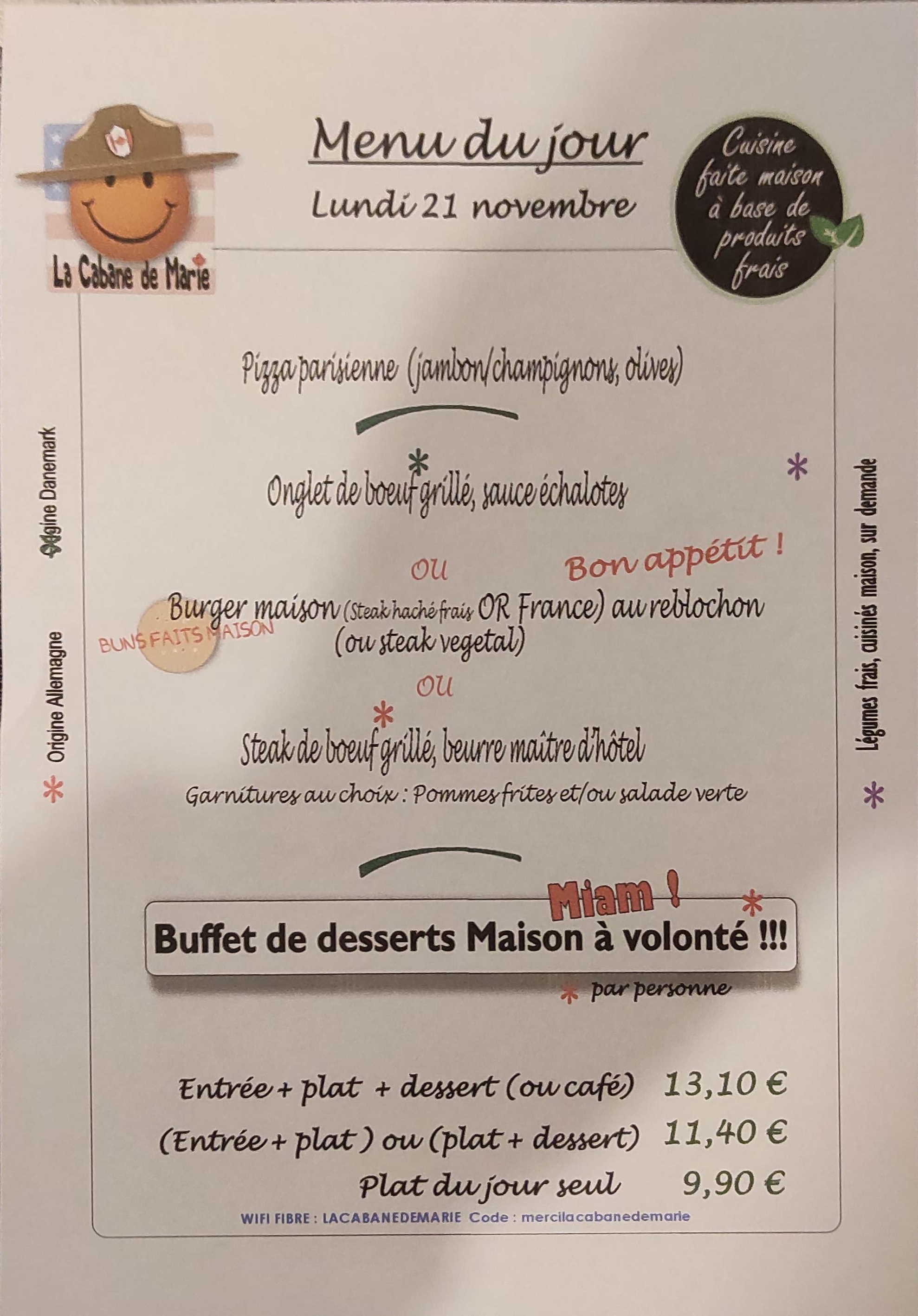 La Cabane de Marie est un lieu chaleureux et très agréable, le personnel est sympathique. Les plats sont très bon, je conseille le menu du jour qui est très bon et très copieux avec le dessert, le prix est très abordable. Les toilettes sont propres. Le style canadien est au rendez-vous et la déco ainsi que le mobilier sont très bien choisis.