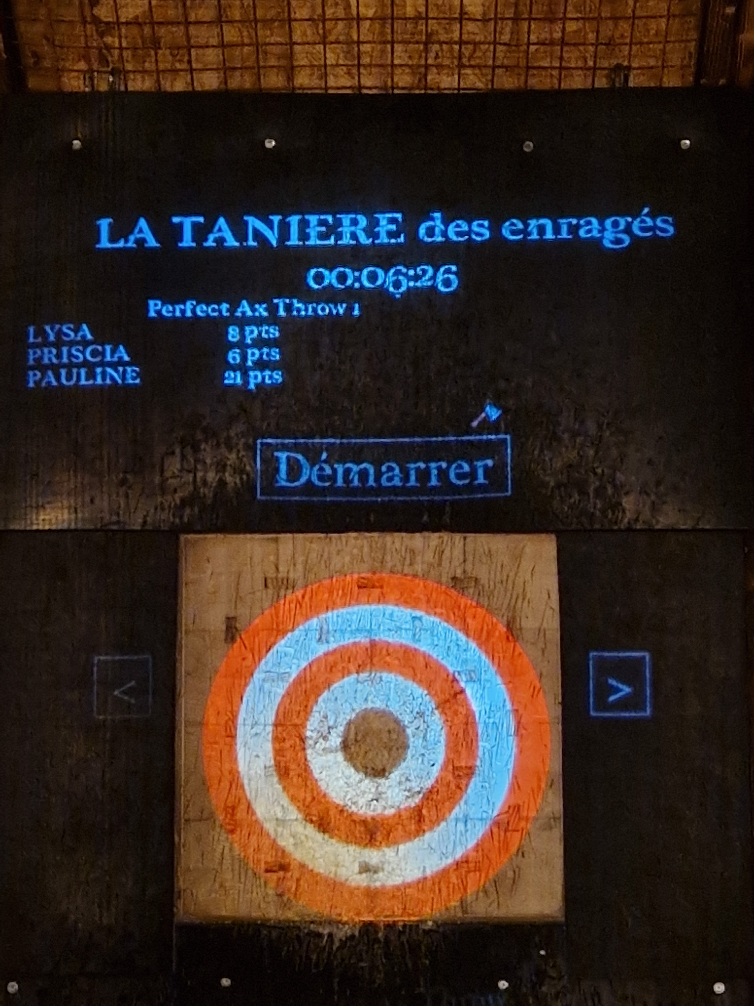 On a adoré !!! Nos amis de Nevers nous avaient réservé une session à la Tanière des enragés : accueil au top de la part de Christelle et Céline, qui ont pris le temps de nous expliquer le concept, et de nous prêter des fléchettes pour qu'on puisse patienter en attendant notre session. Yoann nous a ensuite installés à nos couloirs, a pris le temps de nous expliquer, et est repassé plusieurs fois pour s'assurer qu'on arrivait enfin à mettre dans la cible, nous dispensant à chaque fois de ses bons conseils... Ils semblent passionnés, on a passé un super moment, hors du commun !