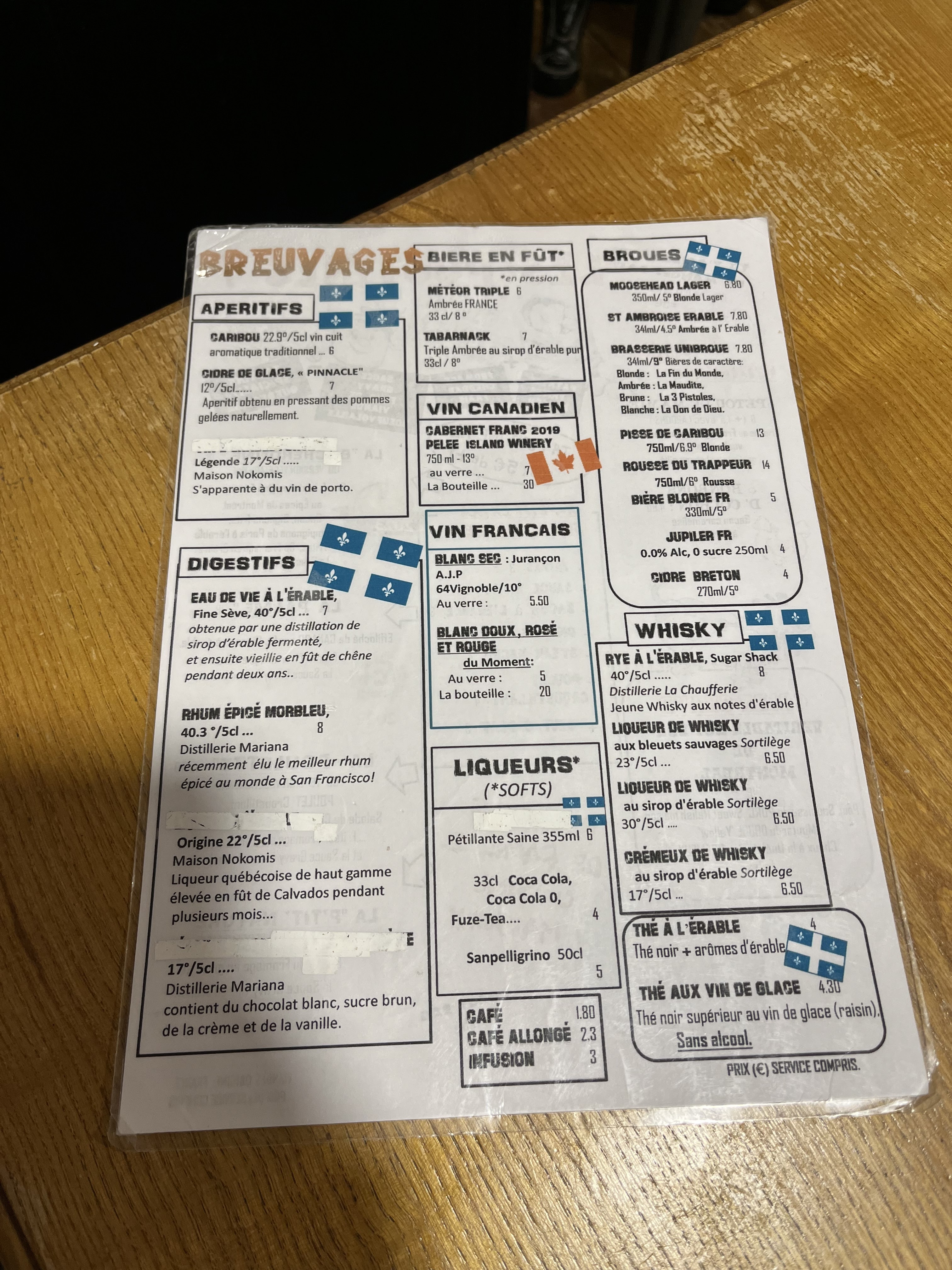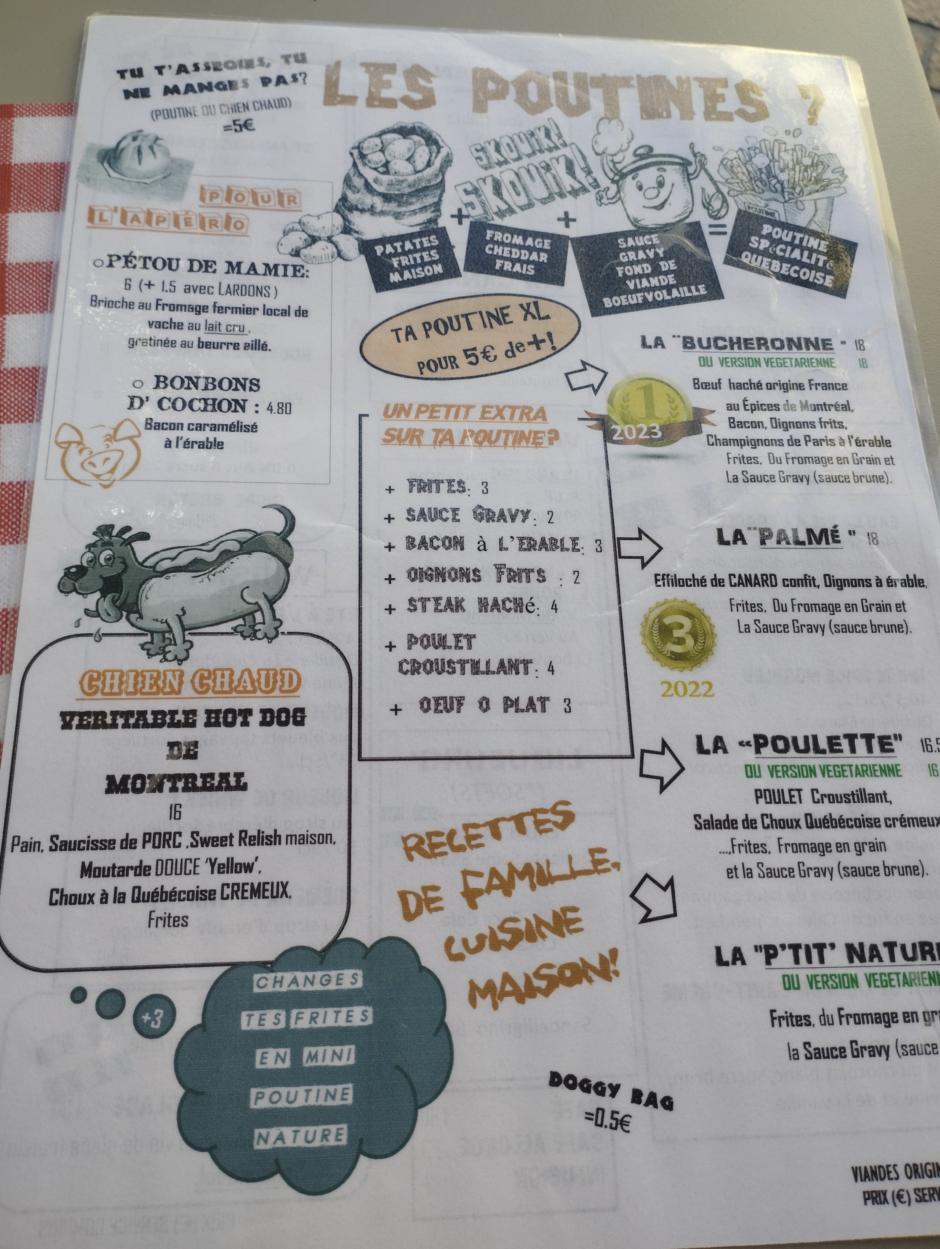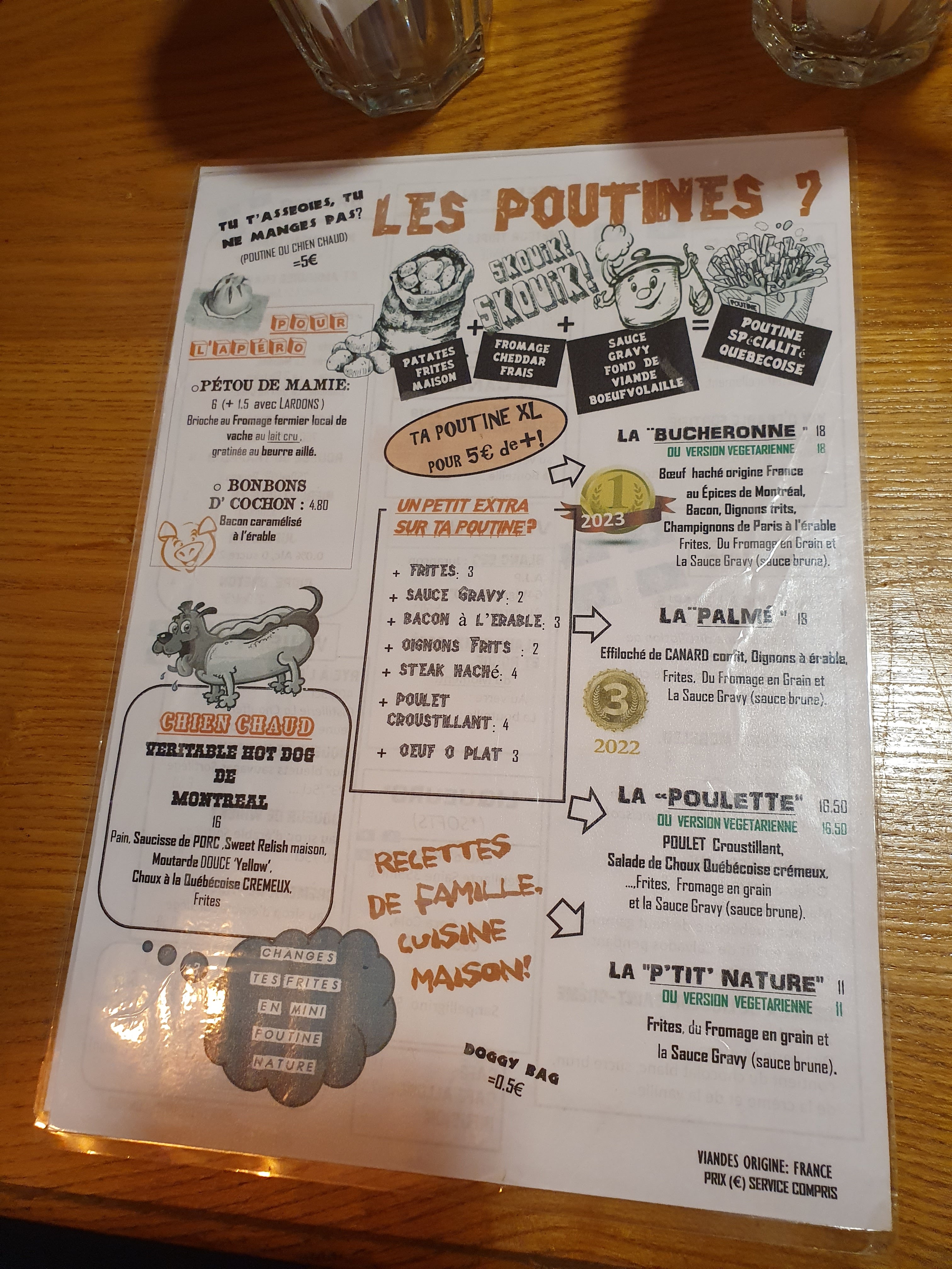 C'était excellent, je me suis régalé, la poutine bûcheronne était top Les tarifs des plats sont très corrects, le menu joint en image ne représente pas l'intégralité des plats disponibles (il y a une autre carte de saison sur place) ! Je trouve cependant le tarifs des boissons assez excessif, notamment les sodas français type coca ou fuze tea à 5€ qui me semble trop élevé Fortement conseillé en tout cas