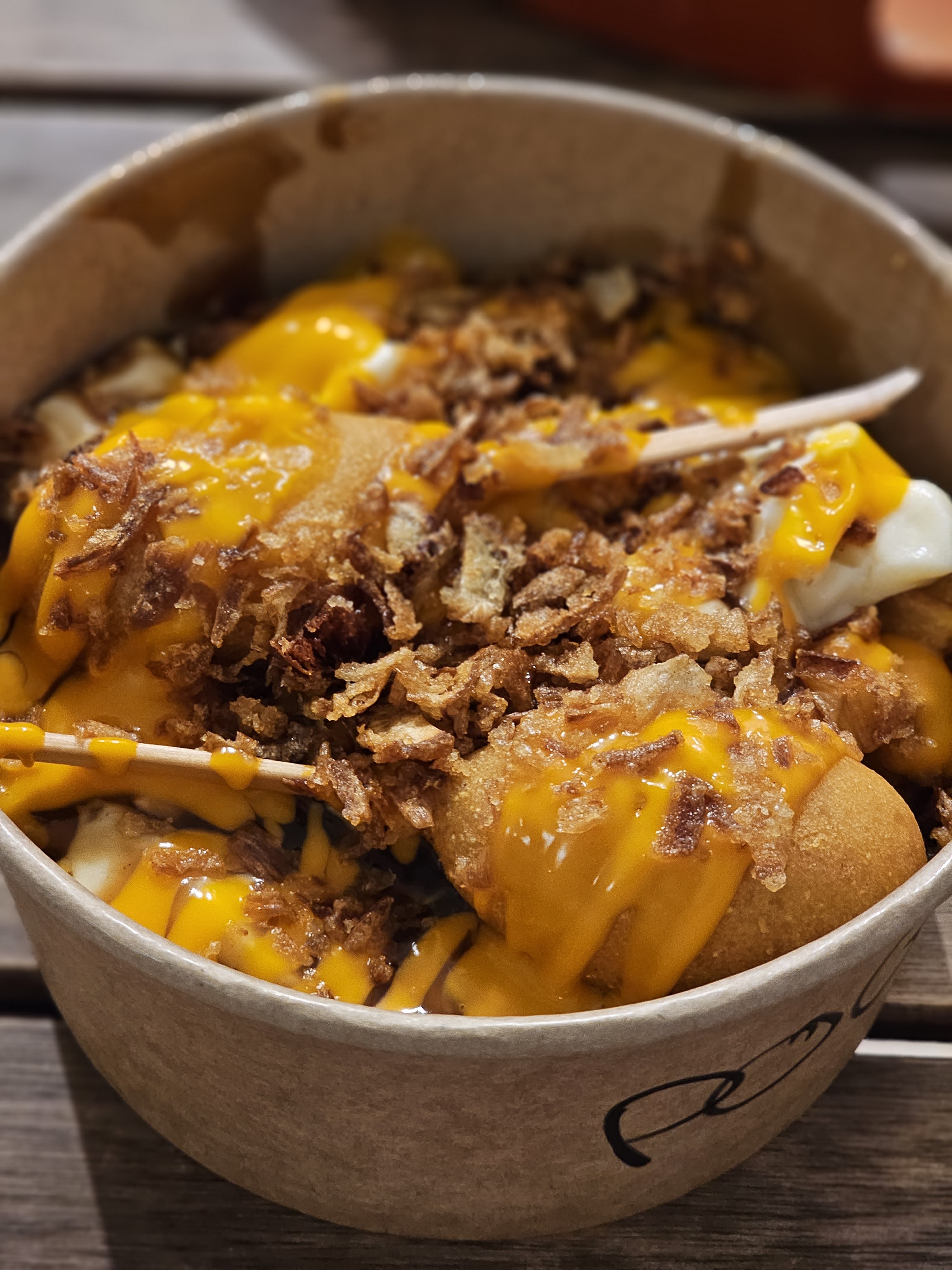 Poutine ok, fromage original et sauce bonne mais sans plus. Le prix via commande internet est très cher. La sauce avait un goût de champignons et j’ai été malade après je ne recommande pas du tout ! Par contre, je recommande les corn dogs malgré le prix élevé ! Ils étaient très très bons ! Après niveau plat c’est arrivé tiède commande Uber Eats oblige ! C’est dommage car je pense que cela a gâché le croustillant des frites !