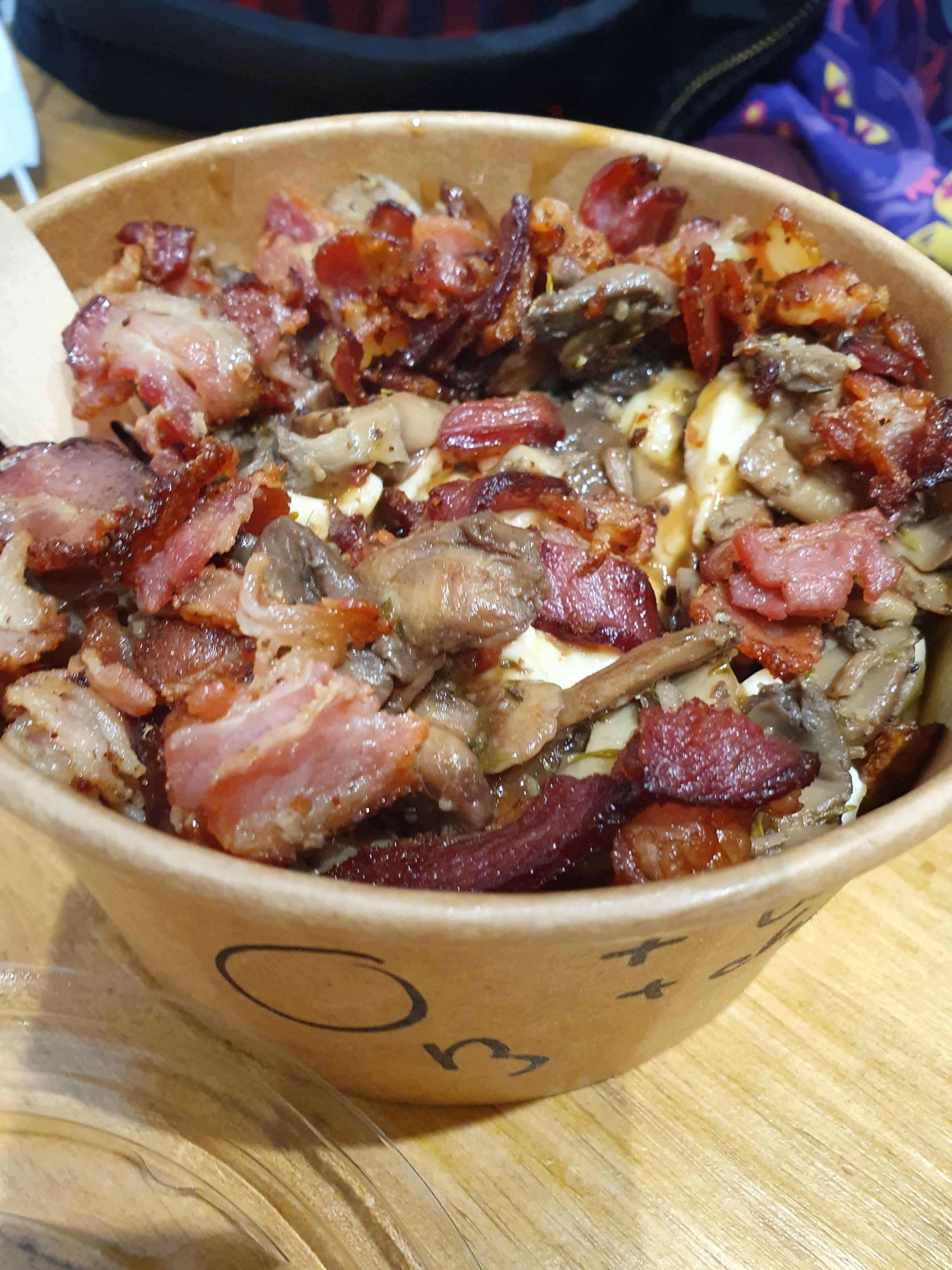 Bonjour, Contrairement à la plus part des avis postés, je n’ai pas apprécié manger cette Poutine servis à 12,50€ dans un emballage en carton et des couverts en plastique. De plus, le menu composé d’un donut et d’une bière s’élève déjà à pratiquement 20€, pour un plat pauvre en viande qui n’a pas su me convaincre, photos mensongères à l’appui