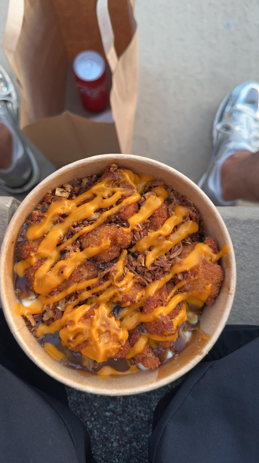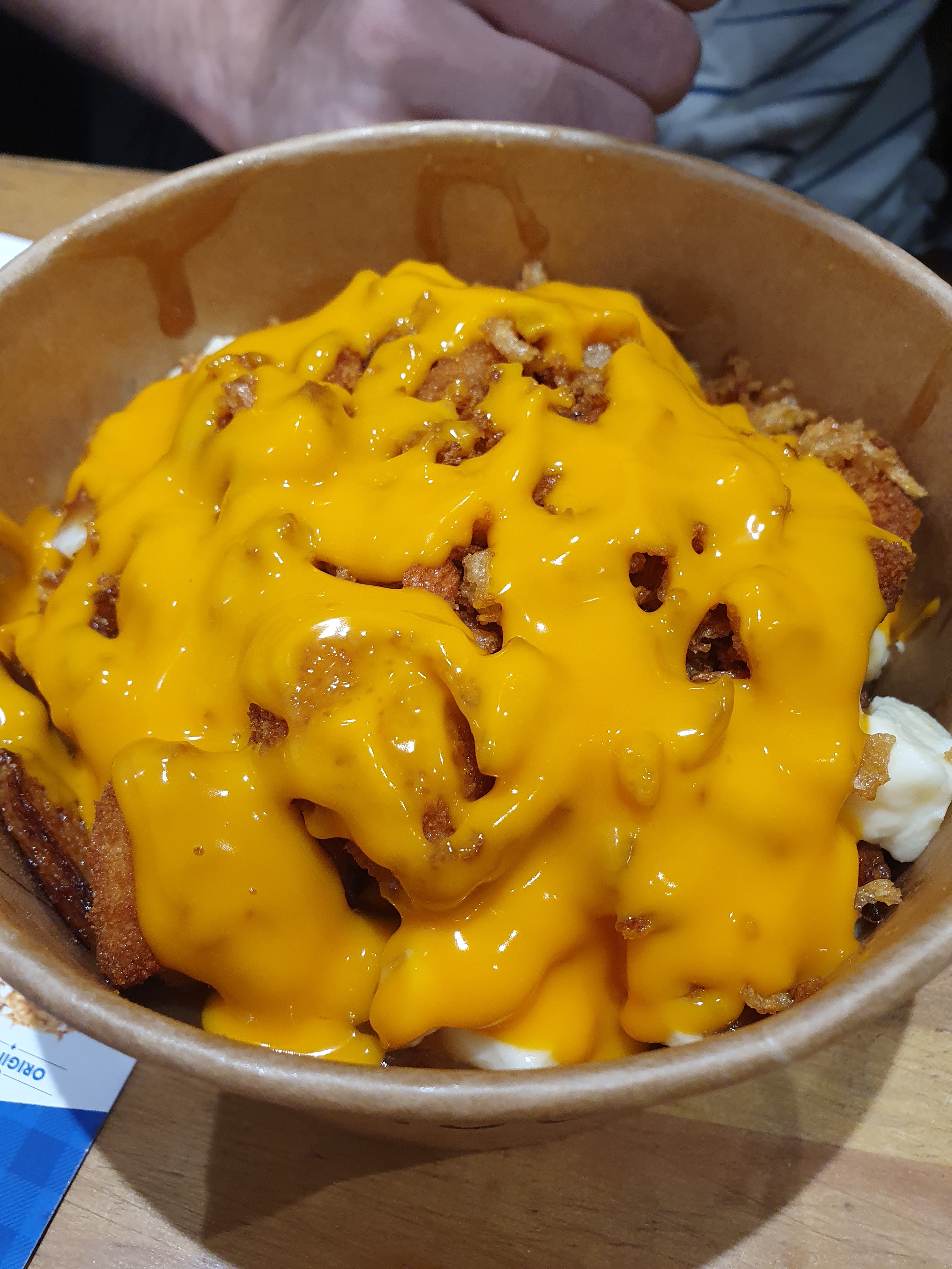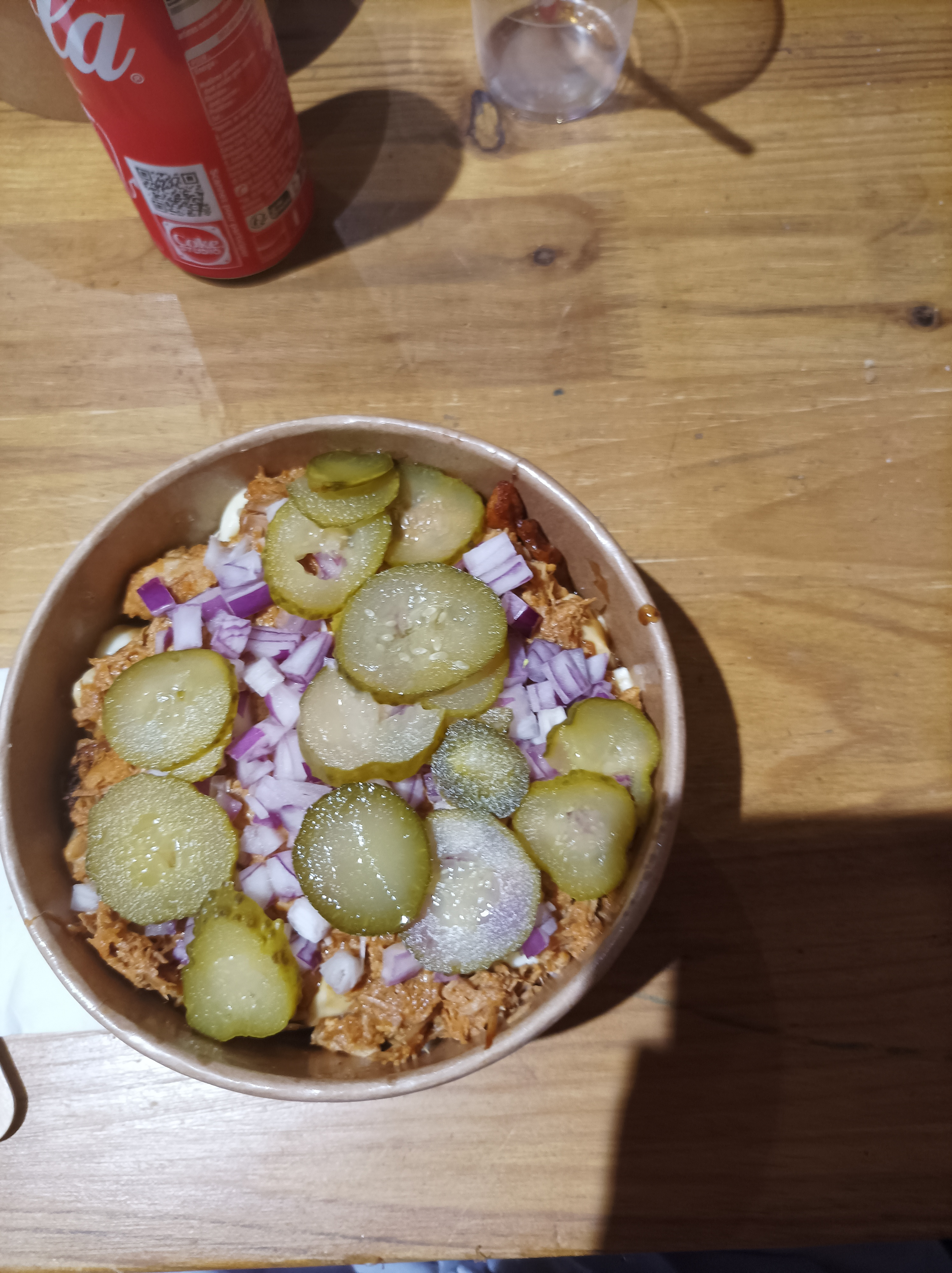 Une déception. Le poulet était bon. Les frites, la sauce et le fromage était passable voir médiocre. Beaucoup trop cher pour ce que c'est, que ce soit niveau qualité et quantité. Et le petit cookie pré-emballé à 3 euros...C'est totalement abusé.