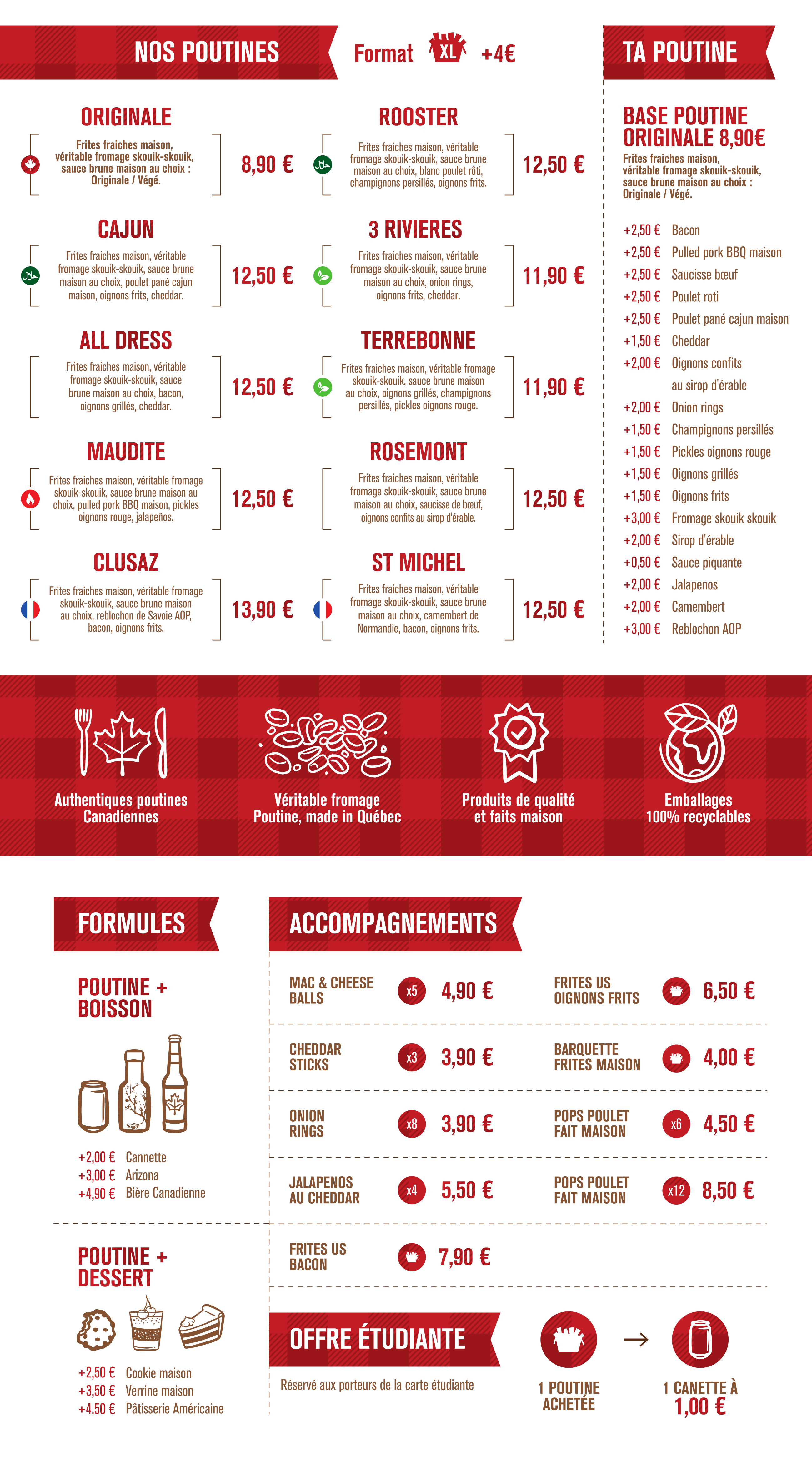La poutine n'est pas mauvaise, cependant j'ai été très déçue des quantités. J'ai commandé une poutine classique à 9.9€ pour avoir un fond d'assiette qui ne ressemblait pas du tout aux quantités présentées sur le comptoir. Idem pour mon conjoint qui avait commandé une poutine XL, la quantité était pratiquement la même que la mienne. C'est dommage. Sinon la déco était sympa.