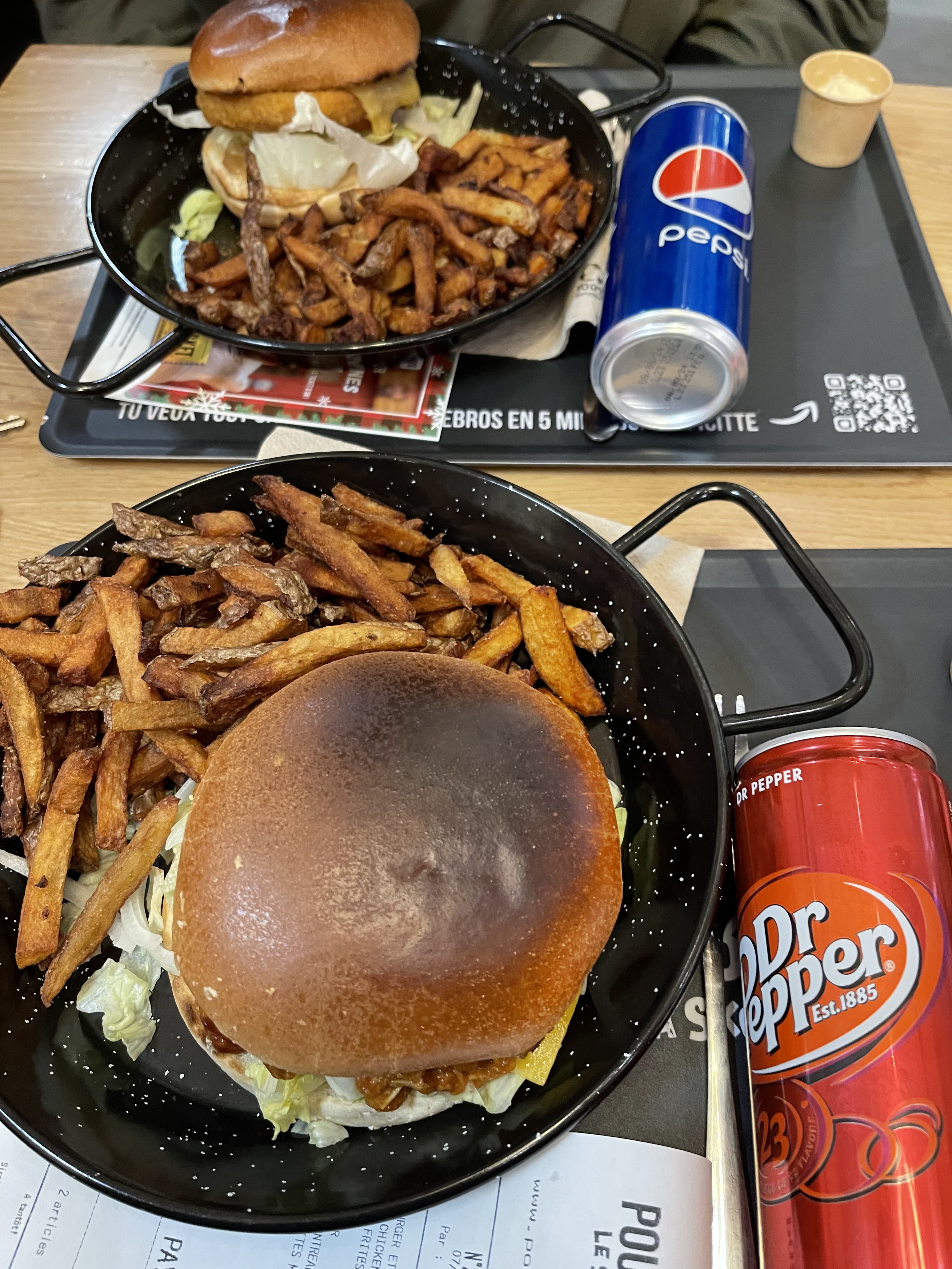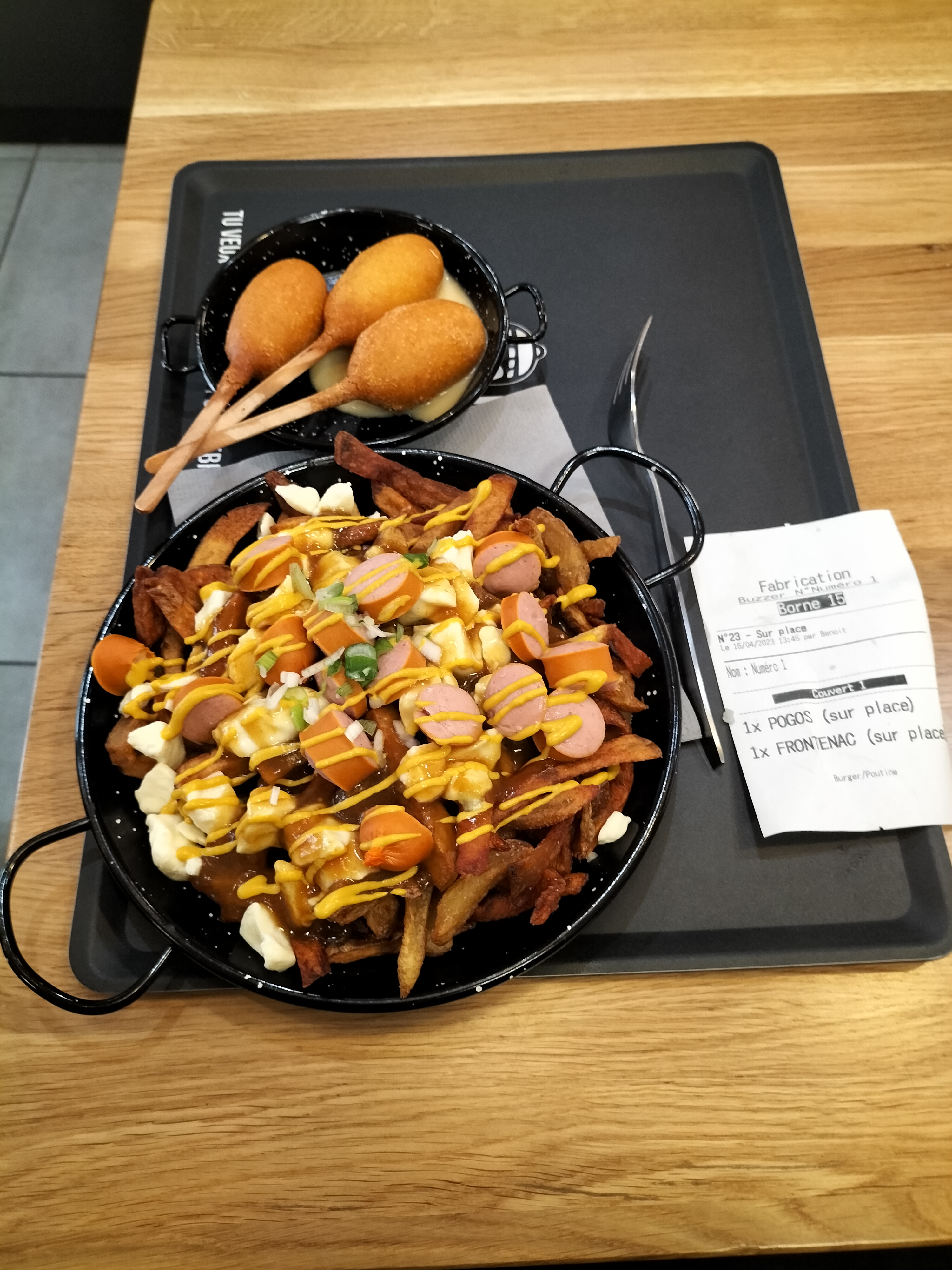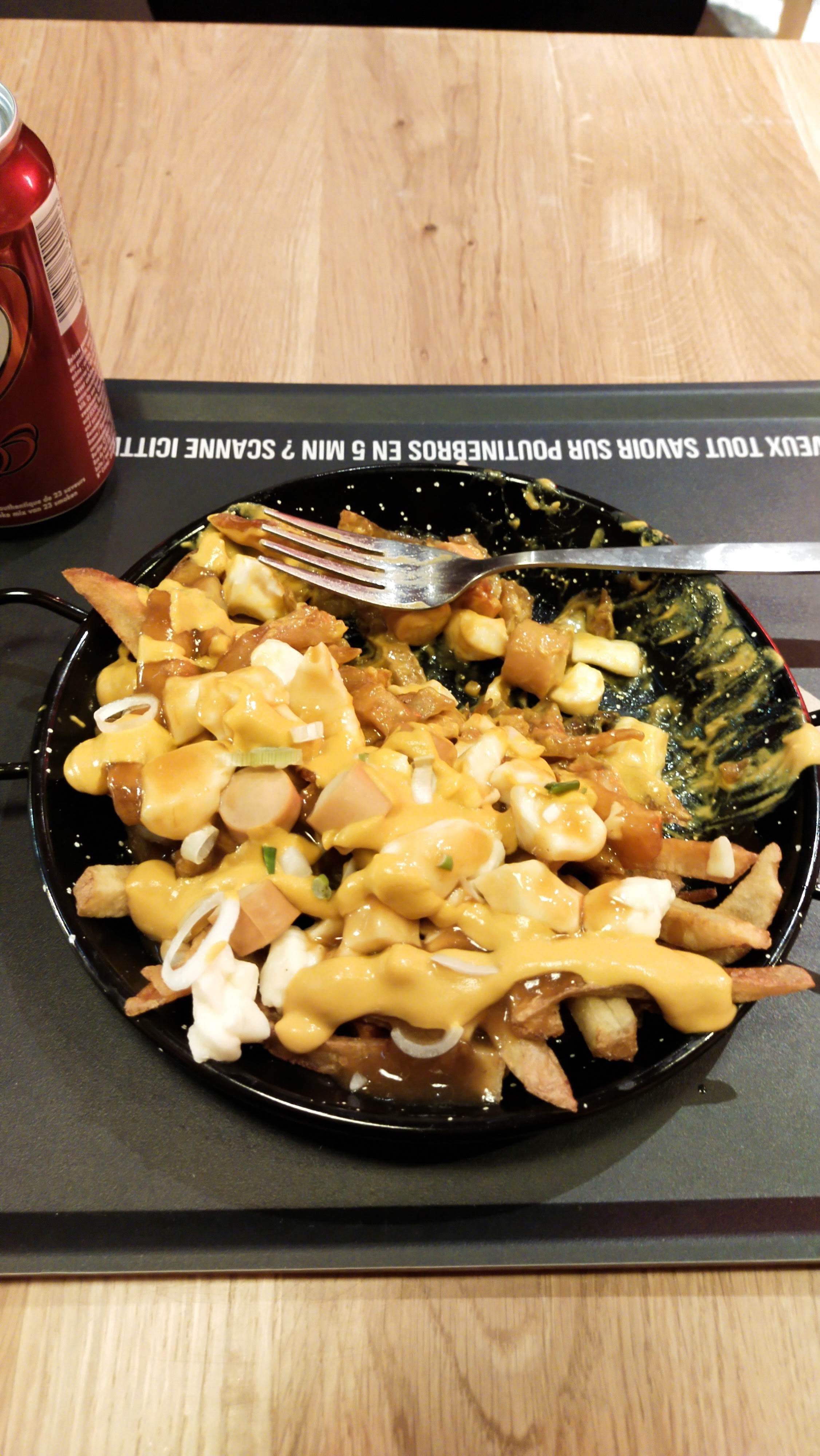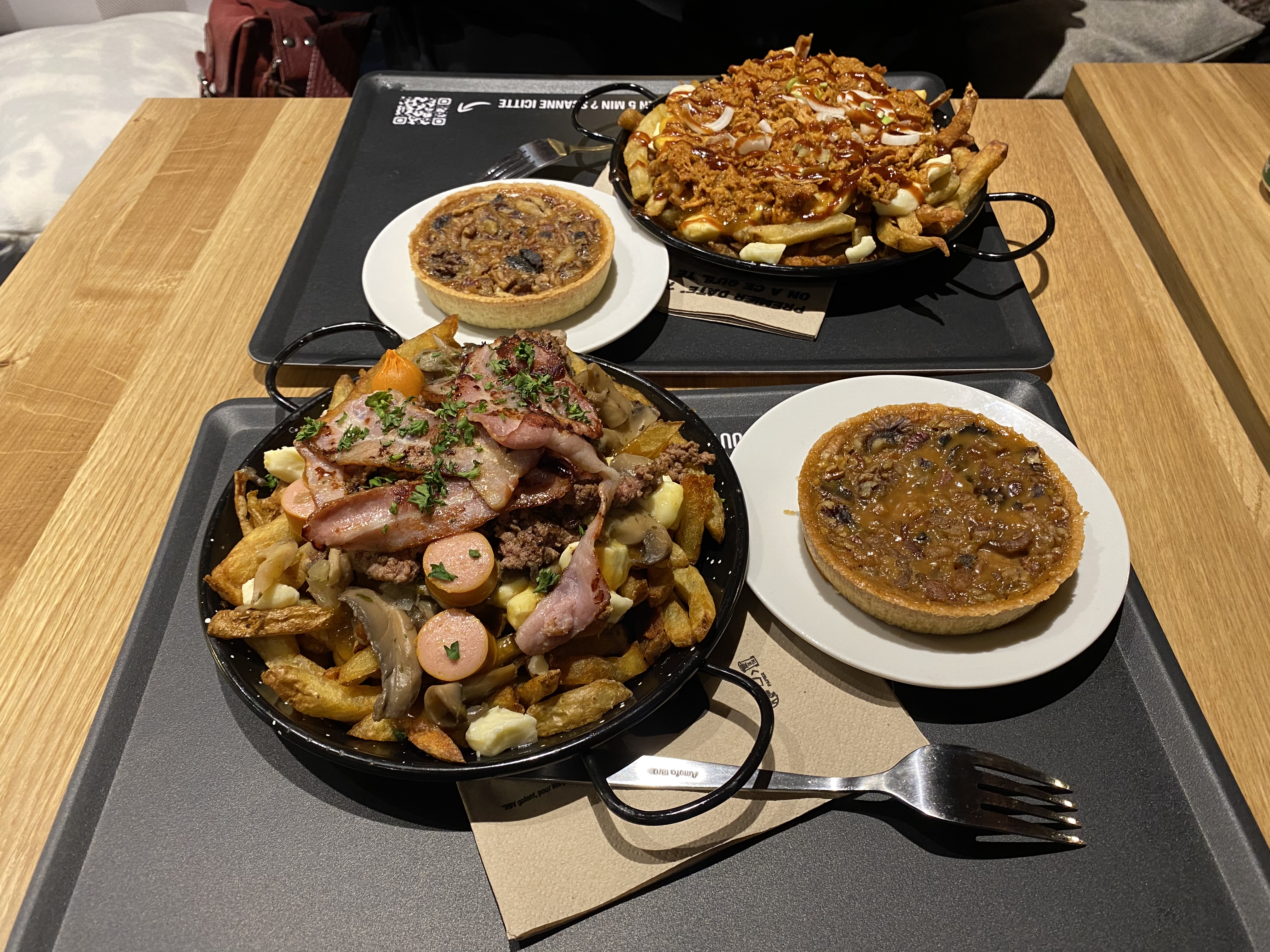 Expérience très mitigée. Je commence par expliquer pourquoi 1 étoile … tout simplement parce que ma femme a été malade après y avoir mangé. Ensuite le goût de la poutine est bon. Le burger par contre sans intérêt. Ce qui me gêne également c’est le prix payé alors qu’il n’y a aucun service ! Commande sur borne/on doit venir chercher le plateau à la caisse une fois prêt (et monter l’escalier cassé gueule avec des plateaux dans les mains)/ le café on nous file une dosette et c’est à nous de descendre pour la mettre dans une machine et se faire le café tout seule / et pour finir pour débarrasser son plateau il faut tout séparer (les bouteilles, les couverts, les plats, les cannettes, les aliments … ! (Cf photo) Bref je ne recommande pas … (Modif suite à votre réponse) : la street food c’est dans la rue et par définition c’est également moins cher ce qui n’est pas le cas de Poutinebros qui propose des tarifs plus cher que les resto québécois mais sans le service … pour rappel même le Mac Donald nous livre à table … je veux bien faire le serveur, mon propre café et débarrasser mais pas avec les tarifs d’un restaurant ! Et de plus je vous rappelle que les ingrédients de la poutine ne valent pas très cher donc bon … on sent bien que c’est plus une histoire de mode et surtout bien étudié pour réduire vos coûts de fonctionnement pour une rentabilité maximum …
